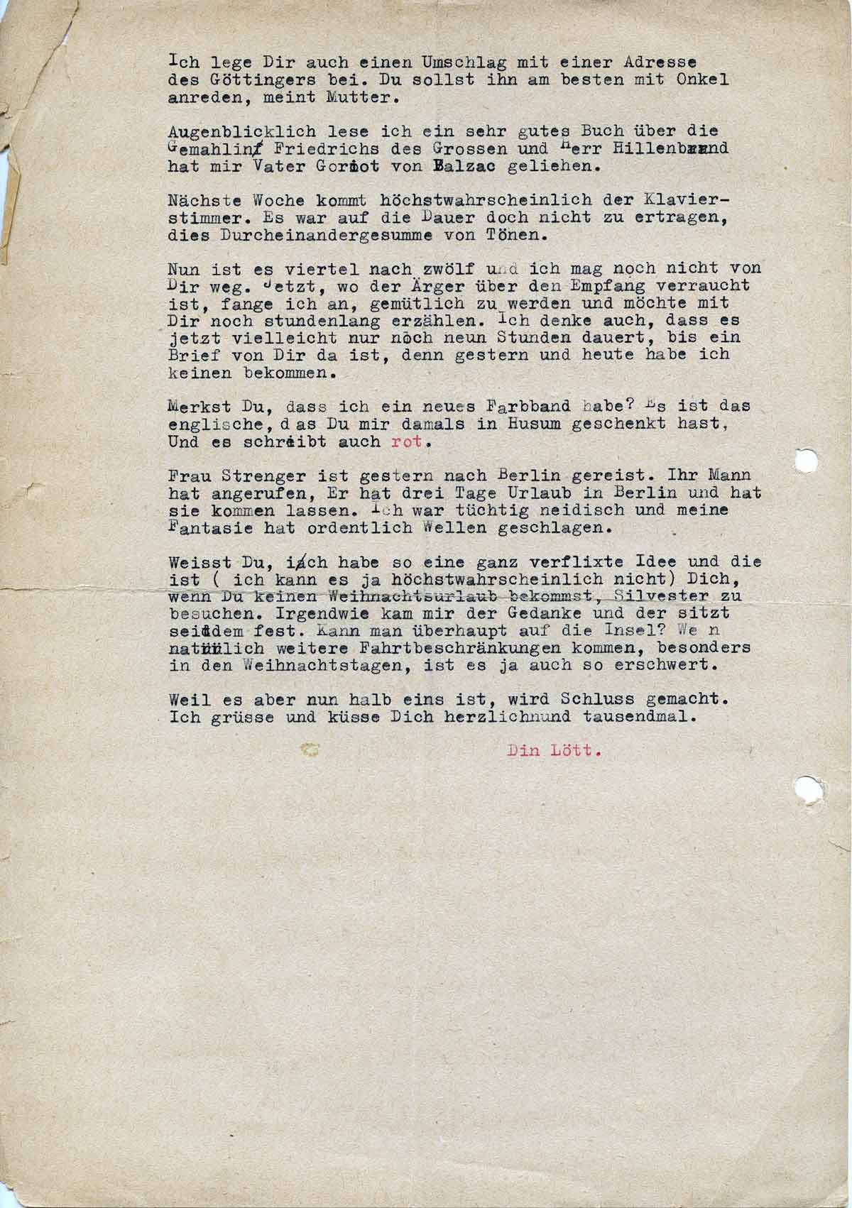 Du glaubst gar nicht, wie es mich kränkt, immer wieder von dem anderen die Meinung zu fühlen oder wie vorige Woche klar zu hören, dass man seine Pflicht nicht tut. Ich glaube bald selber daran. Und man wird so unsicher. Ich bin seit Deinem Weggang noch nicht wieder beim Friseur gewesen, erstens, weil ich so viel zu tun habe, und zweitens, weil ich ganz einfach Deine Mutter scheue, die dann das ganze Register von allem, was man früher nicht tat und heute nötig zu tun haben glaubt, zieht. Es ist weiß Gott so, dass ich bei solchen Reden ein ganz schlechtes Gewissen kriege und das Gefühl, etwas zu tun, was eigentlich nicht sein dürfte.