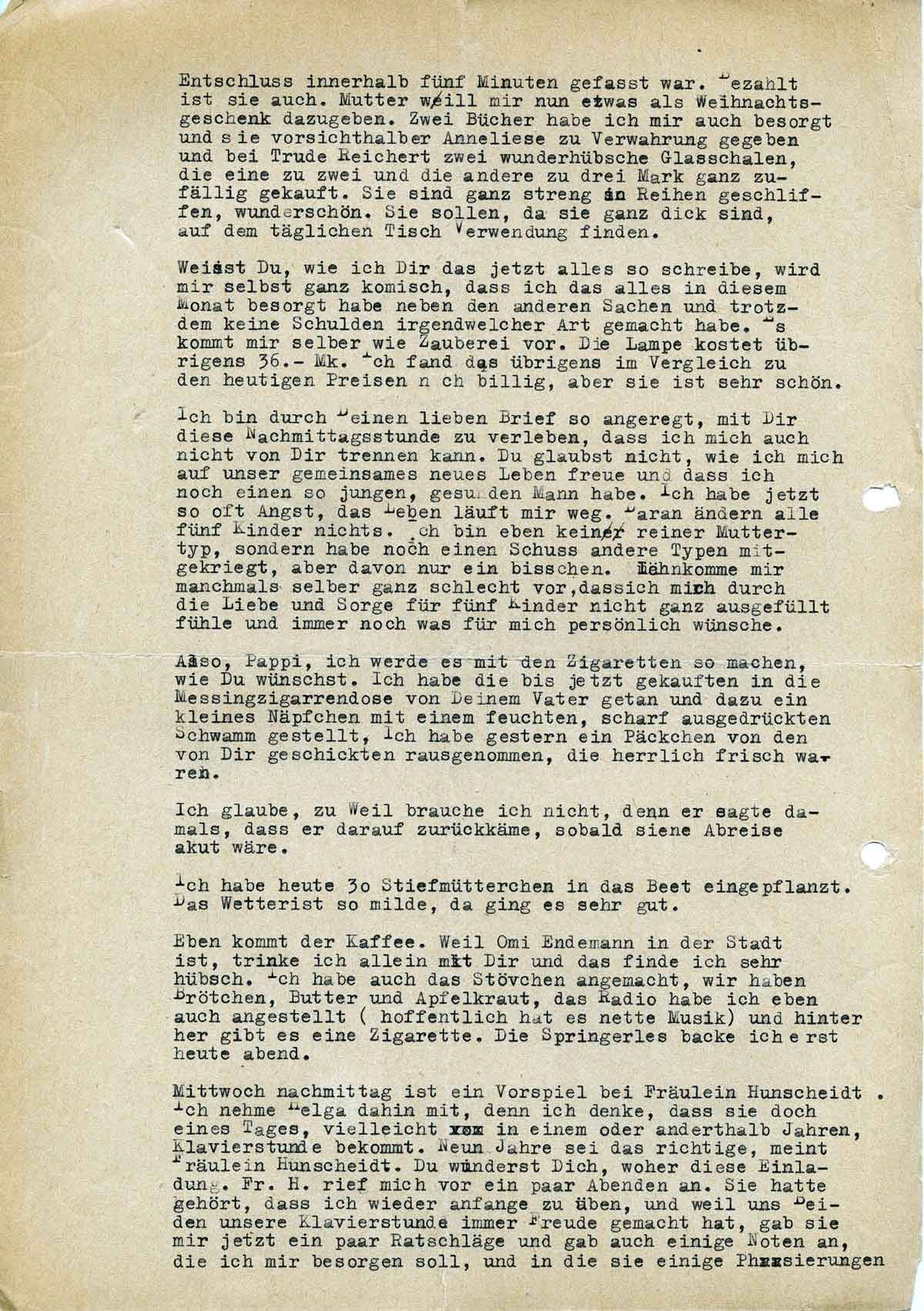 heute morgen kam Dein schöner, lieber, langer Brief und ich danke Dir recht herzlich dafür. Ich konnte ihn so gut gebrauchen, denn ich war so ein bisschen bedrückt. Aber Dein Verständnis meiner Bemühungen, Dir eine leibe Frau zu sein, hat mir sehr gut getan (ich weiss es ja, aber man hört es immer wieder gerne) sodass damit jeder eventuelle Verzicht federleicht wird. Und dann ist es mit dem Verzicht auch halb so schlimm und Du brauchst Dir darum keine Gedanken zu machen. Wir leben hier sehr behaglich, die Kinder bekommen auch ein genau so schönes Weihnachtsfest wie immer, angezogen bin ich jetzt auch schön und das ist mir die Hauptsache, ob ich dazu Geld oder keins brauche, spielt ja nicht die Rolle. Es drückt höchstens meinen Ordnungssinn, dass noch nicht mehr abgetragen ist.