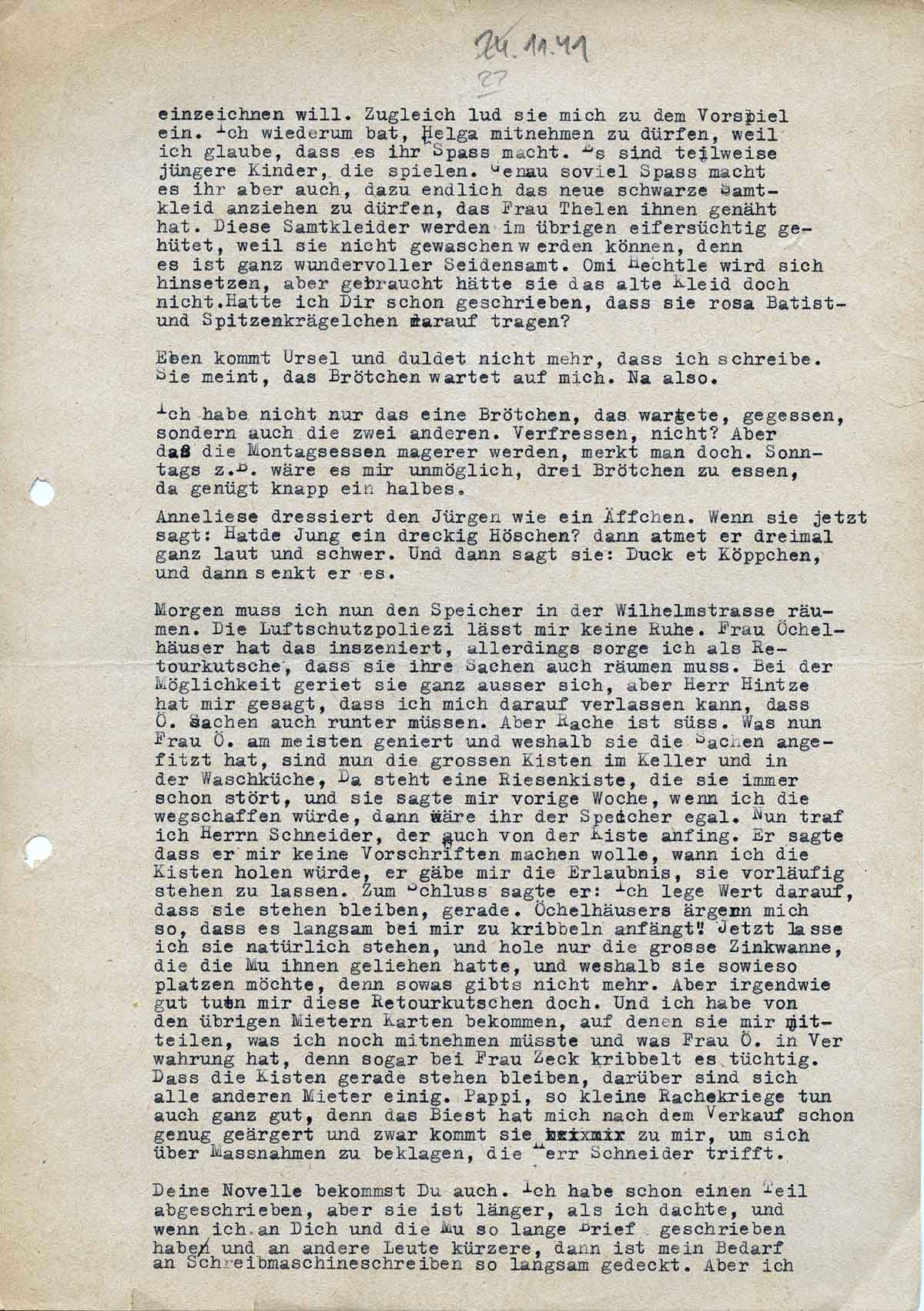 Morgen muss ich nun den Speicher in der Wilhelmstrasse räumen. Die Luftschutzpolizei lässt mir keine Ruhe. Frau Öchelhäuser hat das inszeniert, allerdings sorge ich als Retourkutsche, dass sie ihre Sachen auch räumen muss. Bei der Möglichkeit geriet sie ganz außer sich, aber Herr Hintze hat mir gesagt, dass ich mich darauf verlassen kann, dass Ö.´s Sachen auch runtermüssen. Aber Rache ist süß. Was nun Frau Ö. am meisten geniert und weshalb sie die Sachen angefitzt hat, sind nun die grossen Kisten im Keller und in der Waschküche. Da steht eine Riesenkiste, die sie immer schon stört, und sie sagte mir vorige Woche, wenn ich die wegschaffen würde, dann wäre ihr der Speicher egal. Nun traf ich Herrn Schneider, der auch von der Kiste anfing. Er sagte dass er mir keine Vorschriften machen wolle, wann ich die Kisten holen würde, er gäbe mir die Erlaubnis, sie vorläufig stehen zu lassen. Zum Schluss sagte er: ich lege Wert darauf, dass sie stehen bleiben, gerade. Öchelhäusers ärgern mich so, dass es langsam bei mir zu kribbeln anfängt. Jetzt lasse ich sie natürlich stehen, und hole nur die grosse Zinkwanne, die die Mu ihnen geliehen hatte, und weshalb sie sowieso platzen möchte, denn sowas gibt’s nicht mehr. Aber irgendwie gut tuen mir die Retourkutschen doch. Und ich habe von den übrigen Mietern Karten bekommen, auf denen sie mir mitteilen, was ich noch mitnehmen müsste und was Frau Ö. in Verwahrung hat, denn sogar bei Frau Zeck kribbelt es tüchtig. Dass die Kisten gerade stehen bleiben, darüber sind sich alle anderen Mieter einig. Pappi, so kleine Rachekriege tun auch ganz gut, denn das Biest hat mich nach dem Verkauf schon genug geärgert und zwar kommt sie zu mir, um sich über Massnahmen zu beklagen, die Herr Schneider trifft.