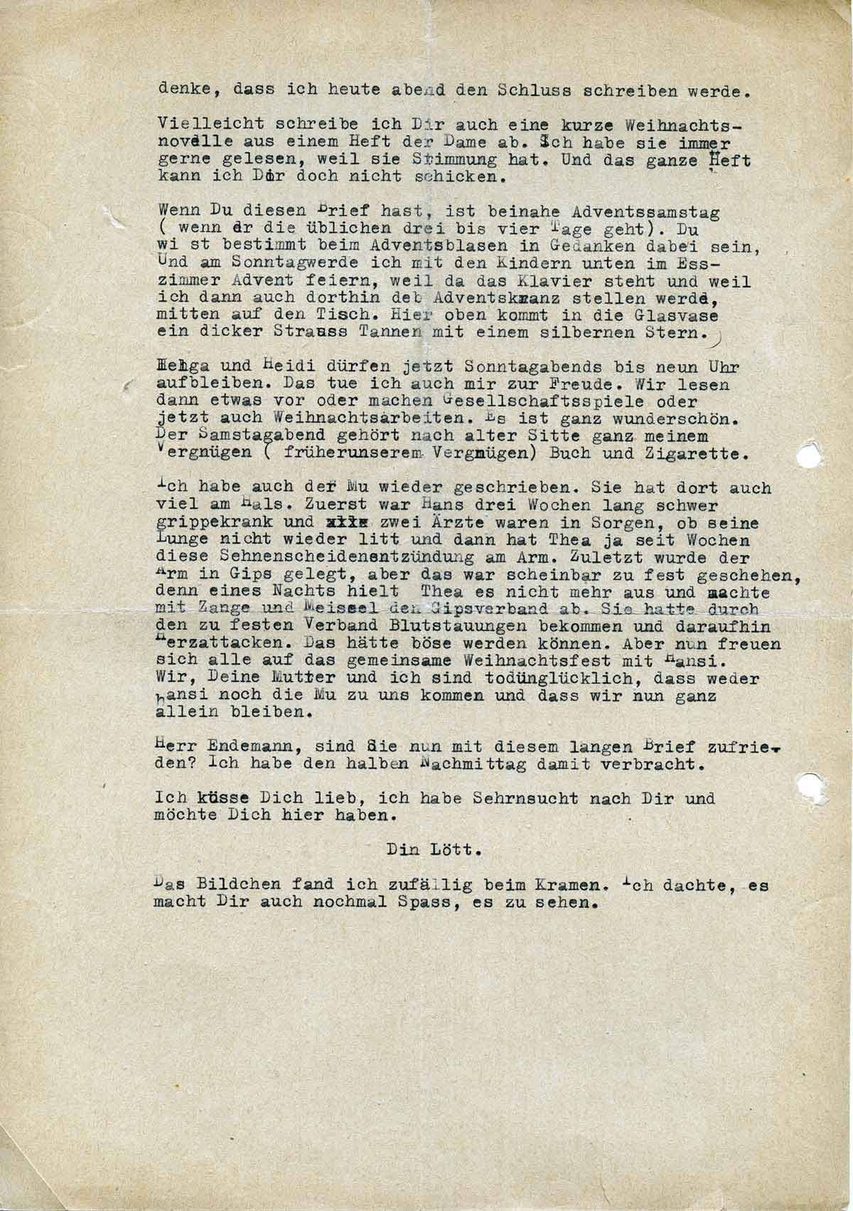 Ich habe auch der Mu wieder geschrieben. Sie hat auch dort viel am Hals. Zuerst war Hans drei Wochen lang schwer grippekrank, und zwei Ärzte machten sich Sorgen, ob seine Lunge nicht wieder litt, und dann hat Thea ja seit Wochen diese Sehnenscheidenentzündung. Zuletzt wurde der Arm in Gips gelegt, aber das war scheinbar zu fest geschehen, denn eines Nachts hielt Thea es nicht mehr aus und machte mit Zange und Meißel den Gipsverband ab. Sie hatte durch den zu festen Verband Blutstauungen bekommen und daraufhin Herzattacken. Das hätte böse werden können. Aber nun freuen sich alle auf das gemeinsame Weihnachtsfest mit Hansi. Wir, Deine Mutter und ich, sind todunglücklich, dass weder die Hansi noch die Mu zu uns kommen und dass wir nun ganz allein bleiben.