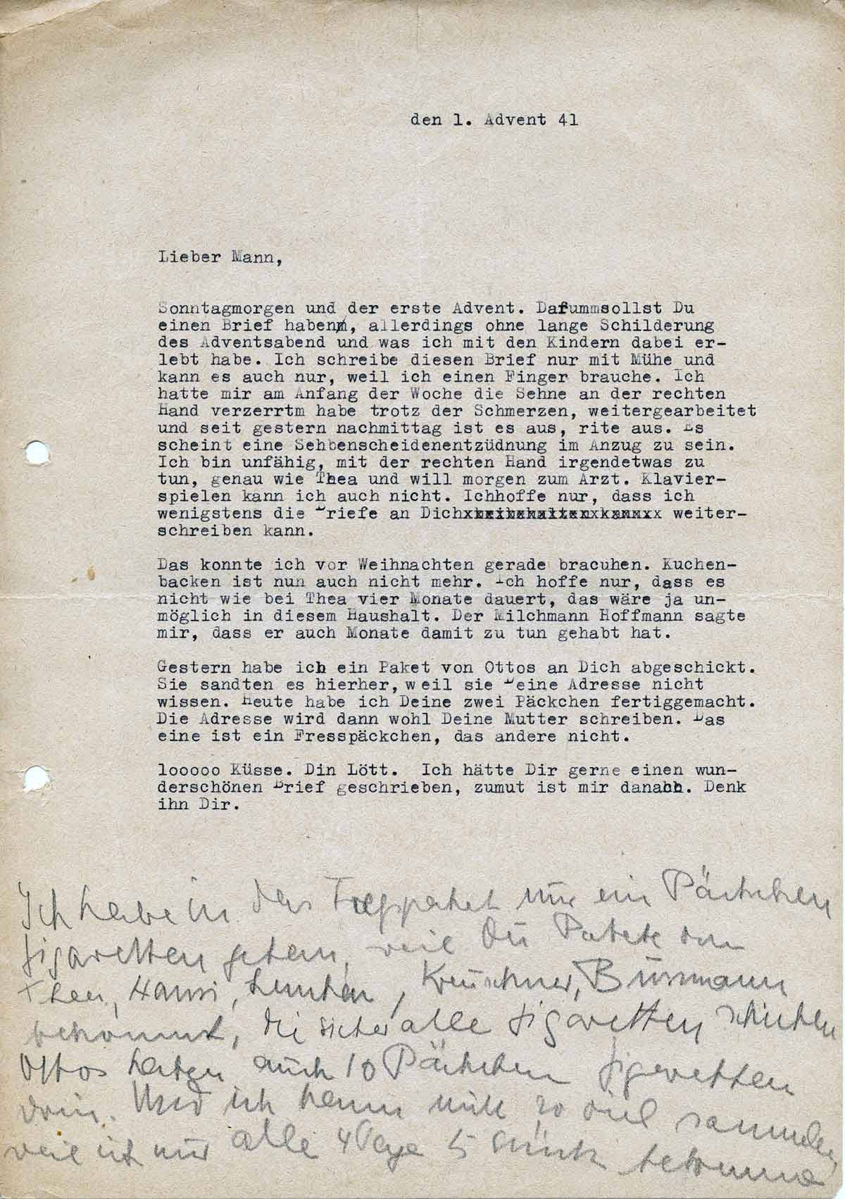 Sonntagmorgen und der erste Advent. Darum sollst Du einen Brief haben, allerdings ohne lange Schilderung. Ich schreibe diesen Brief nur mit Mühe und kann es auch nur, weil ich einen Finger brauche. Ich hatte mir Anfang der Woche die Sehne an der rechten Hand verzerrt, habe trotz Schmerzen weitergearbeitet und seit gestern nachmittag ist es aus, rite aus. Es scheint eine Sehnenscheidenentzündung zu sein. Ich bin unfähig, mit der rechten Hand etwas zu tun, genau wie Thea, und will morgen zum Arzt. Klavierspielen kann ich auch nicht. Ich hoffe nur, dass ich wenigstens die Briefe an Dich weiterschreiben kann.