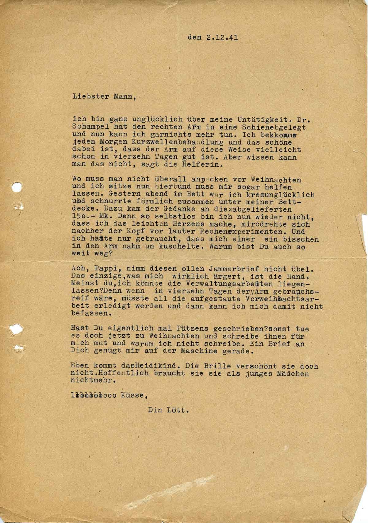 Ach, Pappi, nimm diesen ollen Jammerbrief nicht übel. Das einzige, was mich wirklich ärgert, ist die Hand. Meinst Du, ich könnte die Verwaltungsarbeit liegenlassen? Denn wenn in vierzehn Tagen der Arm gebrauchsreif wäre, müsste all die aufgestaute Vorweihnachtsarbeit erledigt werden und dann kann ich mich damit nicht befassen.