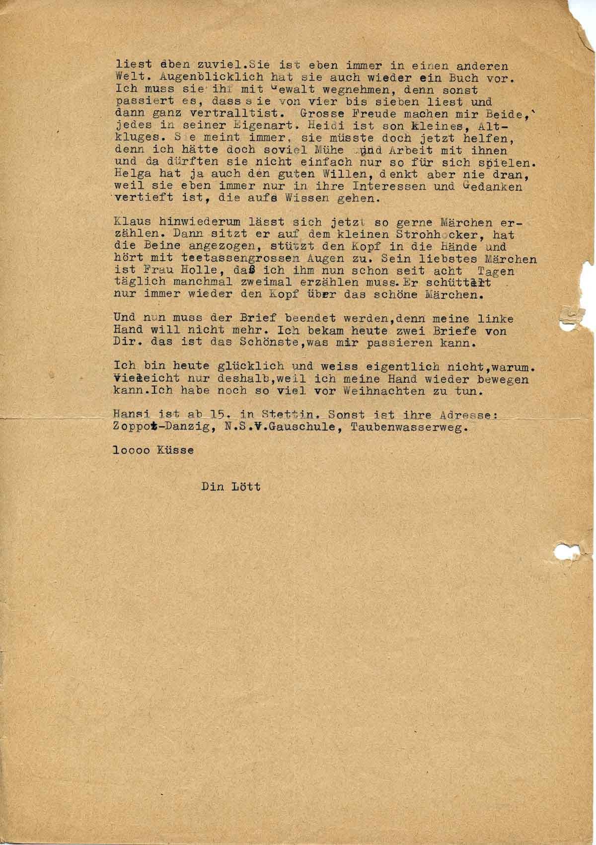 Hansi ist ab 15. in Stettin. Sonst ist ihre Adresse: Zoppot-Danzig, N.S.V.Gauschule, Taubenwasserweg. 10000 Küsse, Din Lött