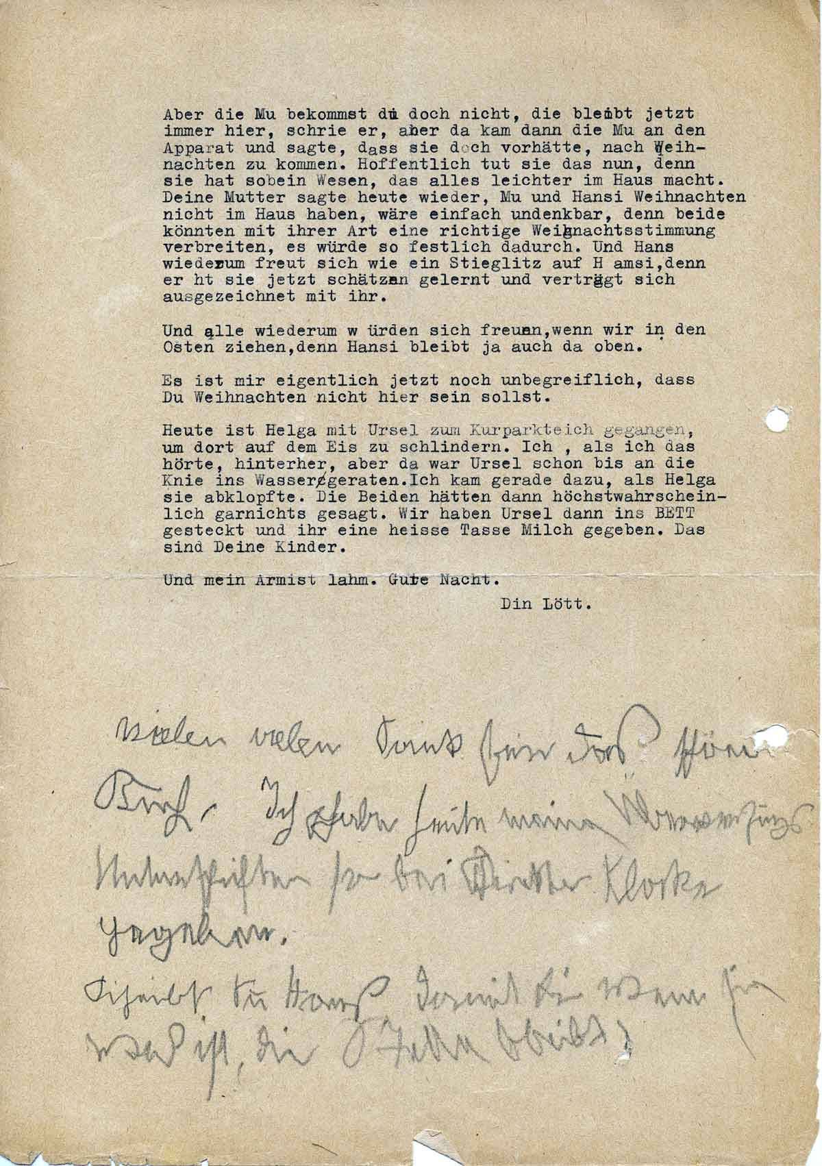 Aber die Mu bekommst Du doch nicht, die bleibt jetzt immer hier, schrie er, aber dann kam die Mu an den Apparat und sagte, dass sie doch vorhätte, nach Weihnachten zu kommen. Hoffentlich tut sie das nun, denn sie hat ein Wesen, das alles leichter im Haus macht.. Deine Mutter sagte heute wieder, Mu und Hansi Weihnachten nicht im Haus haben, wäre einfach undenkbar, denn beide könnten mit ihrer Art eine richtige Weihnachtsstimmung verbreiten, es würde so festlich dadurch. Und Hans wiederum freut sich auch auf Hansi und verträgt sich jetzt mit ihr.