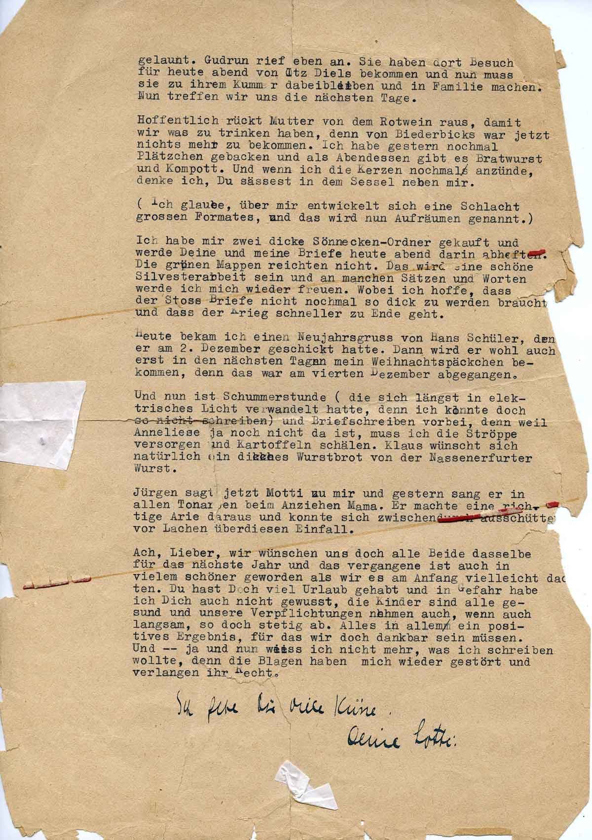 Ach, Lieber, wir wünschen uns doch alle beide dasselbe für das nächste Jahr, und das ver-gangene ist auch in vielem besser geworden als wir es am Anfang dachten. Du hast doch viel Urlaub gehabt, und in Gefahr habe ich Dich auch nicht gewusst, die Kinder sind alle gesund, und unsere Verpflichtungen nehmen auch, wenn auch langsam, so doch stetig ab. Alles in allem ein positives Ergebnis, für das wir doch dankbar sein müssen. Und --- ja nun weiß ich nicht mehr, was ich schreiben wollte, denn die Blagen haben mich wieder gestört und verlangen ihr Recht.