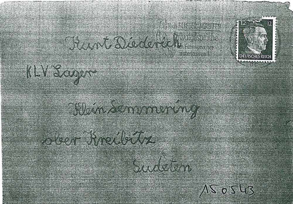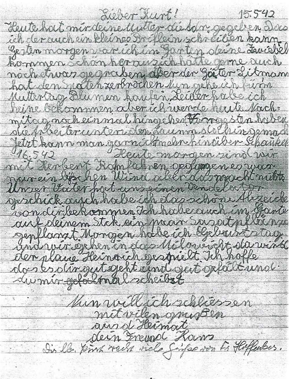 [Fortsetzung 16.5.43:] Heute morgen sind wir mit Herbert Kahn fahren gegangen, es war nur ein bißchen Wind, aber das macht nichts. Unser Vater hat uns einen Vendelator [Ventilator] geschickt, auch habe ich das schöne Abzeichen von dir bekommen. Ich habe auch im Garten auf deinem Stück ein paar Salatpflänzchen gepflanzt. Morgen habe ich Geburtstag und wir gehen in das Milowicht [Milowitsch], da wird der blaue Heinrich gespielt. Ich hoffe, daß es dir gut geht und gut gefällt und du mir mal schreibst. Nun will ich schließen mit vielen Grüßen aus der Heimat dein Freund Hans. Dir lb. Kurt recht viele Grüße von Fr. Hoffacker