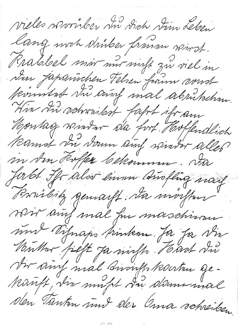 vieles worüber Du Dich Dein Leben lang noch drüber freuen wirst. Krabbel mir nur nicht zu viel in den japanischen Felsen herum sonst könntest du auf mal abrutschen. Wie Du schreibst fahrt ihr am Montag wieder da fort. Hoffentlich kannst du auch wieder alles in den Koffer bekommen. Da habt Ihr aber einen Ausflug nach Kreibitz gemacht. Da möchten wir auch mal hin marschieren und Schnaps trinken. Ja ja die Mutter sieht ja nichts. Hast Du Dir auch mal Ansichtskarten gekauft, die mußt Du dann mal den Tanten und der Oma schreiben.