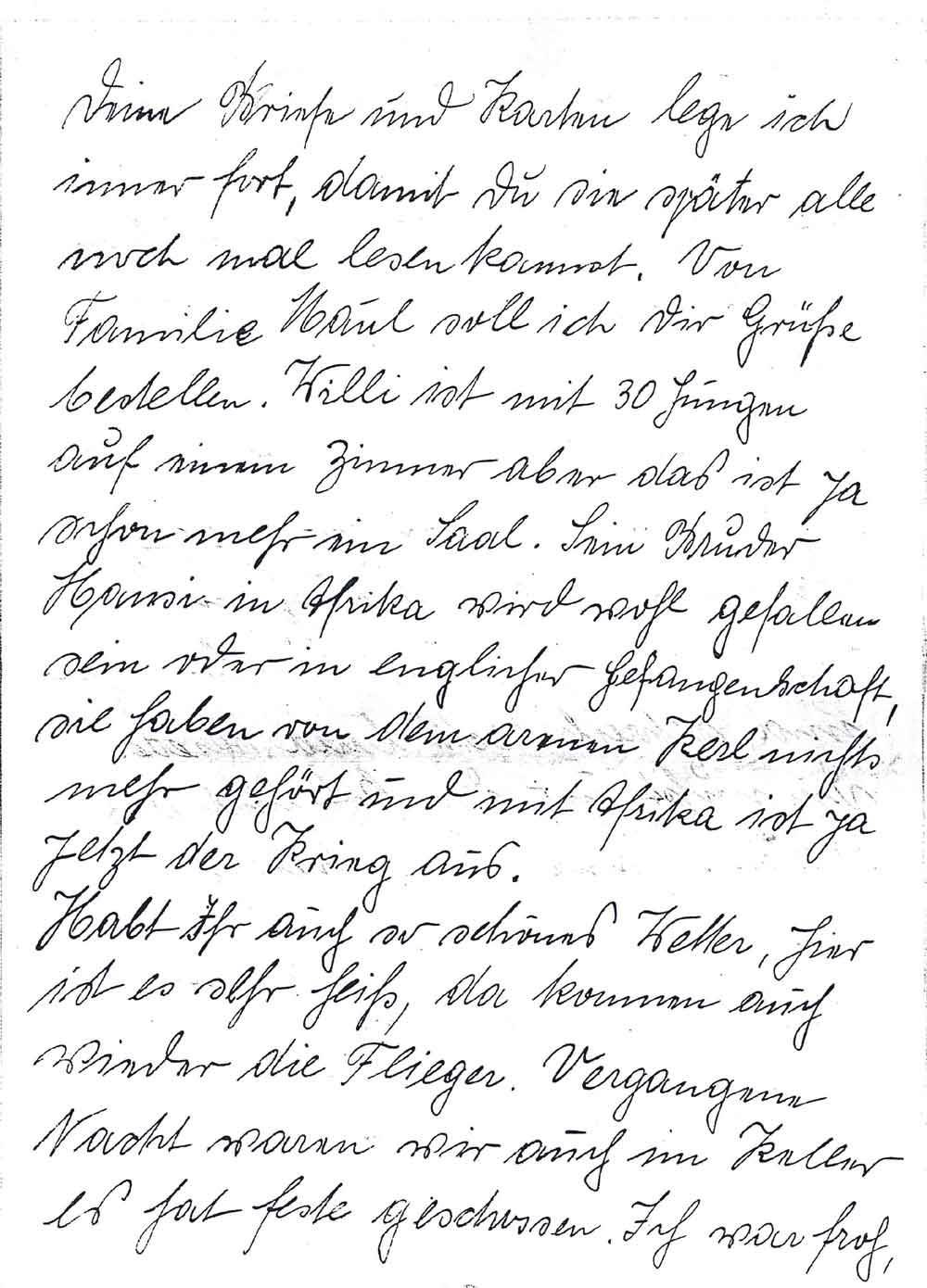 Deine Briefe und Karten lege ich immer fort, damit Du sie später alle noch mal lesen kannst. Von Familie Maul soll ich Dir Grüße bestellen. Willi ist mit 30 Jungen auf einem Zimmer aber das ist ja schon mehr ein Saal. Sein Bruder Hansi in Afrika wird wohl gefallen sein oder in englischer Gefangenschaft, sie haben von dem armen Kerl nichts mehr gehört und mit Afrika ist ja jetzt der Krieg aus.