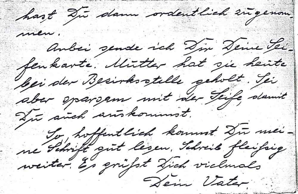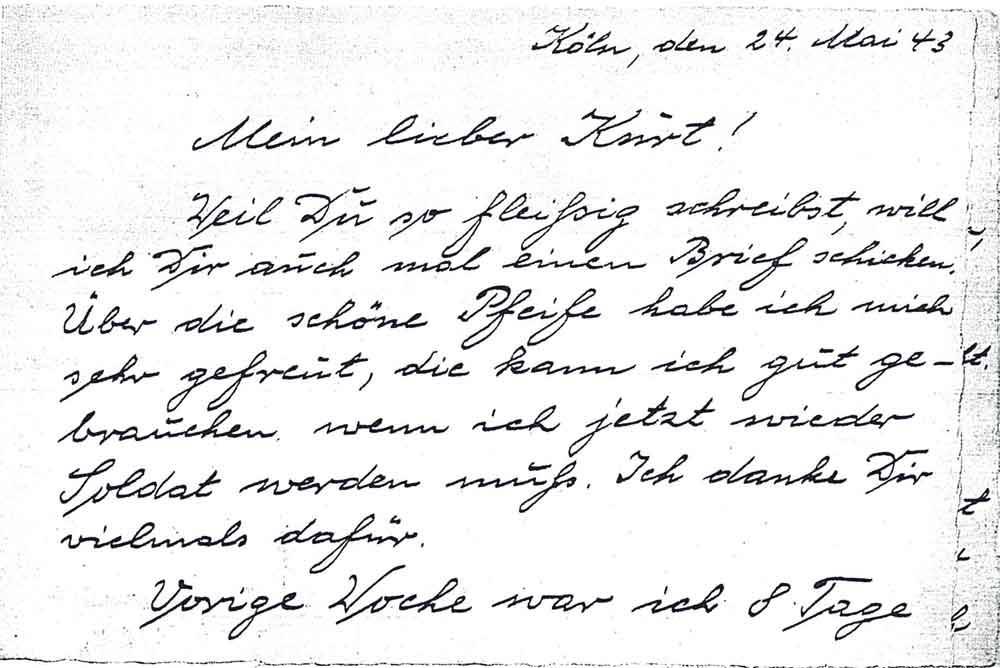 Weil du so fleißig schreibst, will ich Dir auch mal einen Brief schicken. Übr die schöne Pfeife habe ich mich sehr gefreut, die kann ich gut gebrauchen wenn ich jetzt wieder Soldat werden muß. Ich danke Dir vielmals dafür.