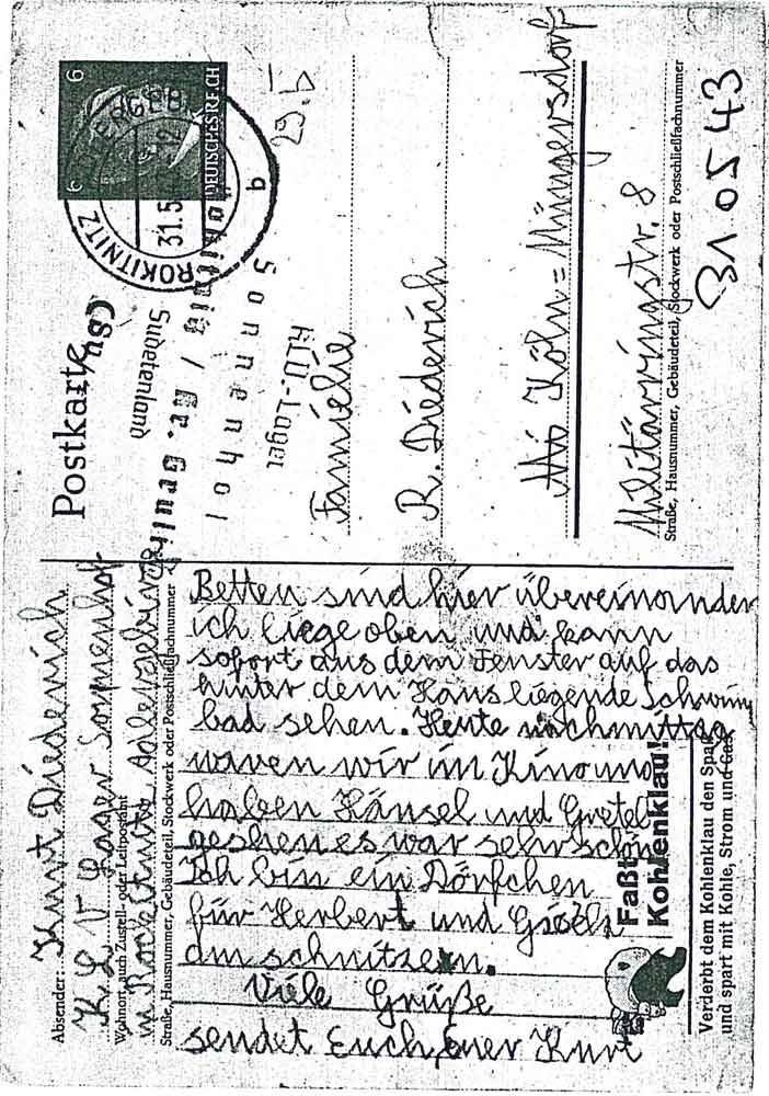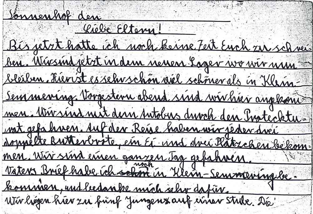 Bis jetzt hatte ich noch keine Zeit Euch zu schreiben. Wir sind jetzt in dem neuen Lager wo wir nun bleiben. Hier ist es sehr schön viel schöner als in Klein-Semmering. Vorgestern abend sind wir hier angekommen. Wir sind mit dem Autos durch den Proteckturat gefahren. Auf der Reise haben wir jeder drei doppelte Butterbrote, ein Ei und drei Plätzchen bekommen. Wir sind einen ganzen Tag gefahren.