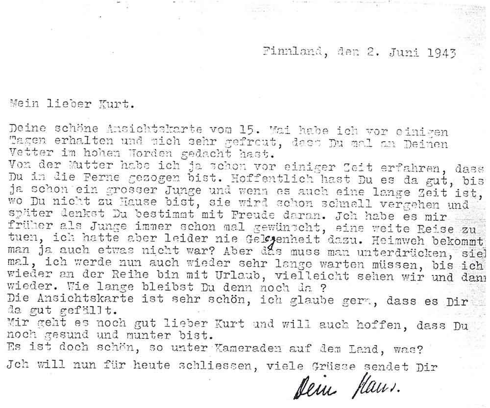 Mein lieber Kurt. Deine schöne Ansichtskarte vom 15. Mai habe ich vor einigen Tagen erhalten und mich sehr gefreut, dass du mal an Deinen Vetter im hohen Norden gedacht hast.