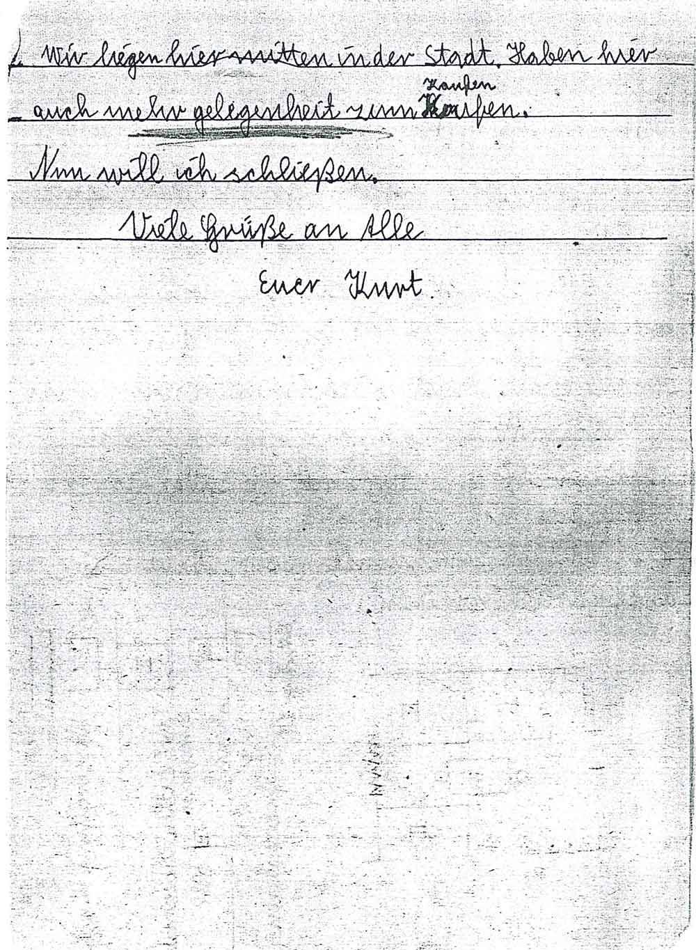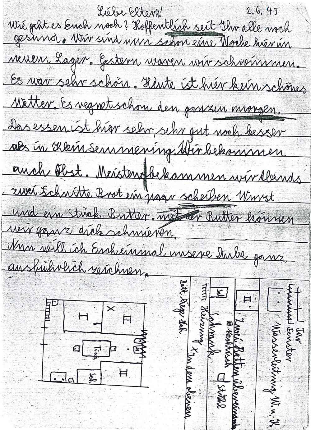 Wie geht es Euch noch? Hoffentlich seid Ihr alle noch gesund. Wir sind nun schon eine Woche hier im neuen Lager. Gestern waren wir schwimmen. Es war sehr schön. Heute ist hier kein schönes Wetter. Es regnet schon den ganzen Morgen. Das Essen ist hier sehr, sehr gut noch besser als in klein-Semmering. Wir bekommen auch Obst. Meistens bekommen wir abends zwei Schnitten Brot, ein paar Scheiben Wurst und ein Stück Butter. Mit der Butter können wir ganz dick schmieren.