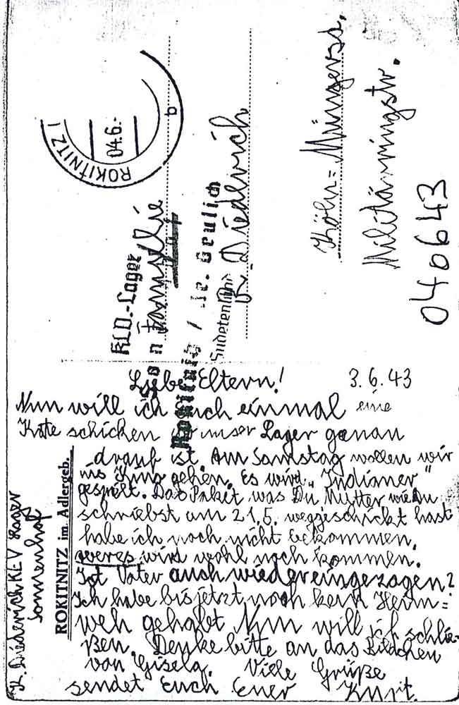 Nun will ich euch einmal eine Karte schicken wo unser Lager genau drauf ist. Am Samstag wollen wir ins Kino gehen. Es wird "Indianer" gespielt. Das Paket was Du Mutter wie du schreibst am 21.5 weggeschickt hast habe ich noch nicht bekommen. Aber es wird wohl noch kommen. Ist Vater auch wieder eingezogen? Ich habe bis jetzt noch kein Heimweh gehabt. Nun will ich schließen. Denke bitte an das Bildchen von Gisela. Viele Grüße sendet Euch Euer Kurt.