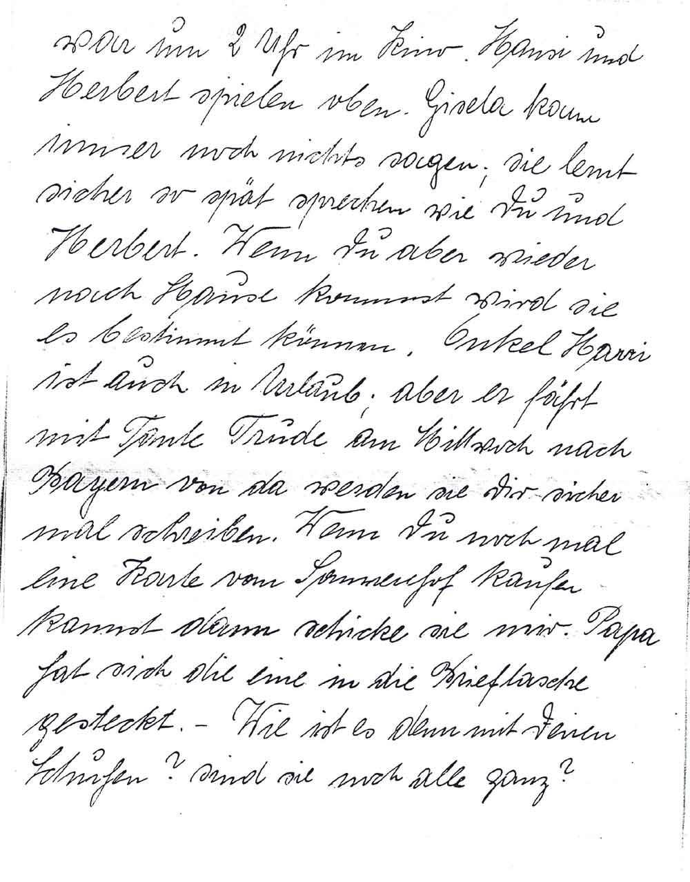 war um 2 Uhr im Kino. Hansi und Herbert spielen oben. Gisela kann immer noch nichts sagen; sie lernt sicher so spät sprechen wie Du und Herbert. Wenn Du aber wieder nach Hause kommst wird sie es bestimmt können. Onkel Harri ist auch im Urlaub; aber er fährt mit Tante Trude am Mittwoch nach Bayern von da werden sie dir sicher mal schreiben. Wenn Du noch mal eine Karte vom Sonnenhof kaufen kannst dann schicke sie mir. Papa hat sich die eine in die Brieftasche gesteckt. Wie ist es denn mit Deinen Schuhen? sind sie noch alle ganz?