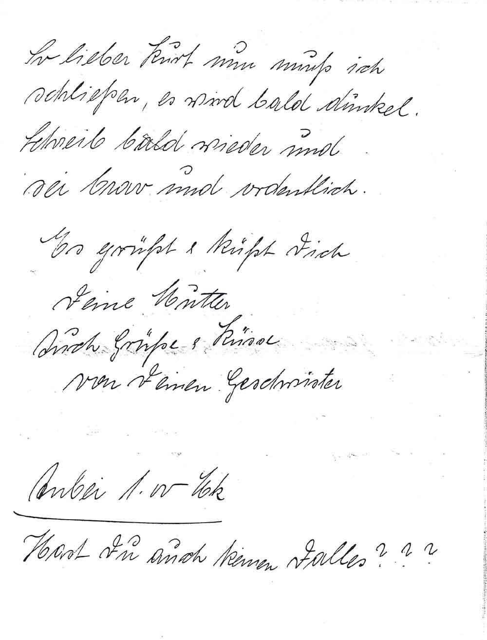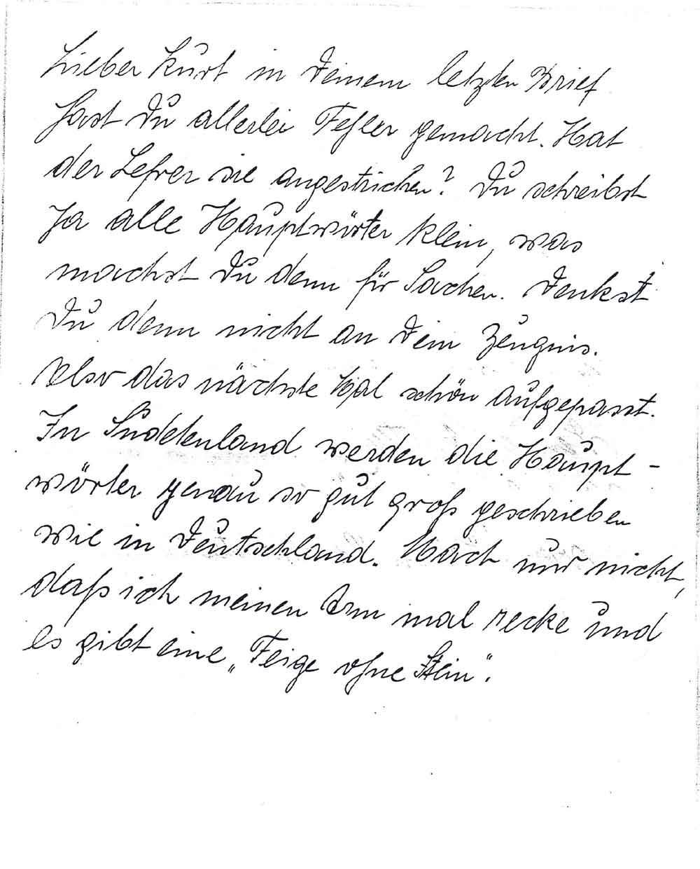 Lieber Kurt in Deinem letzten Brief hast Du allerlei Fehler gemacht. Hat der Lehrer sie angestrichen? Du schreibst ja alle Hauptwörter klein, was machst Du denn für Sachen. Denkst Du denn nicht an Dein Zeugnis. Also das nächste Mal schön aufgepasst. In Sudetenland werden die Hauptwörter genau so gut groß geschrieben wie in Deutschland. Mach nur nicht, daß ich meinen Arm mal recke und es gibt eine "Feige ohne Stein".