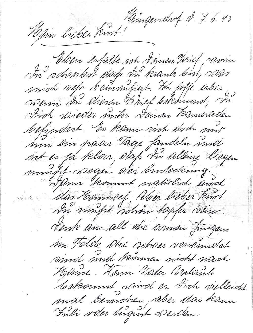 Eben erhalte ich Deinen Brief, worin Du schreibst daß Du krank bist, was mich sehr beunruhigt. Ich hoffe aber wenn Du diesen Brief bekommst Du Dich wieder unter Deinen Kameraden befindest. Es kann sich doch nur um ein paar Tage handeln und ist es ja klar, daß Du alleine liegen mußt wegen der Ansteckung.