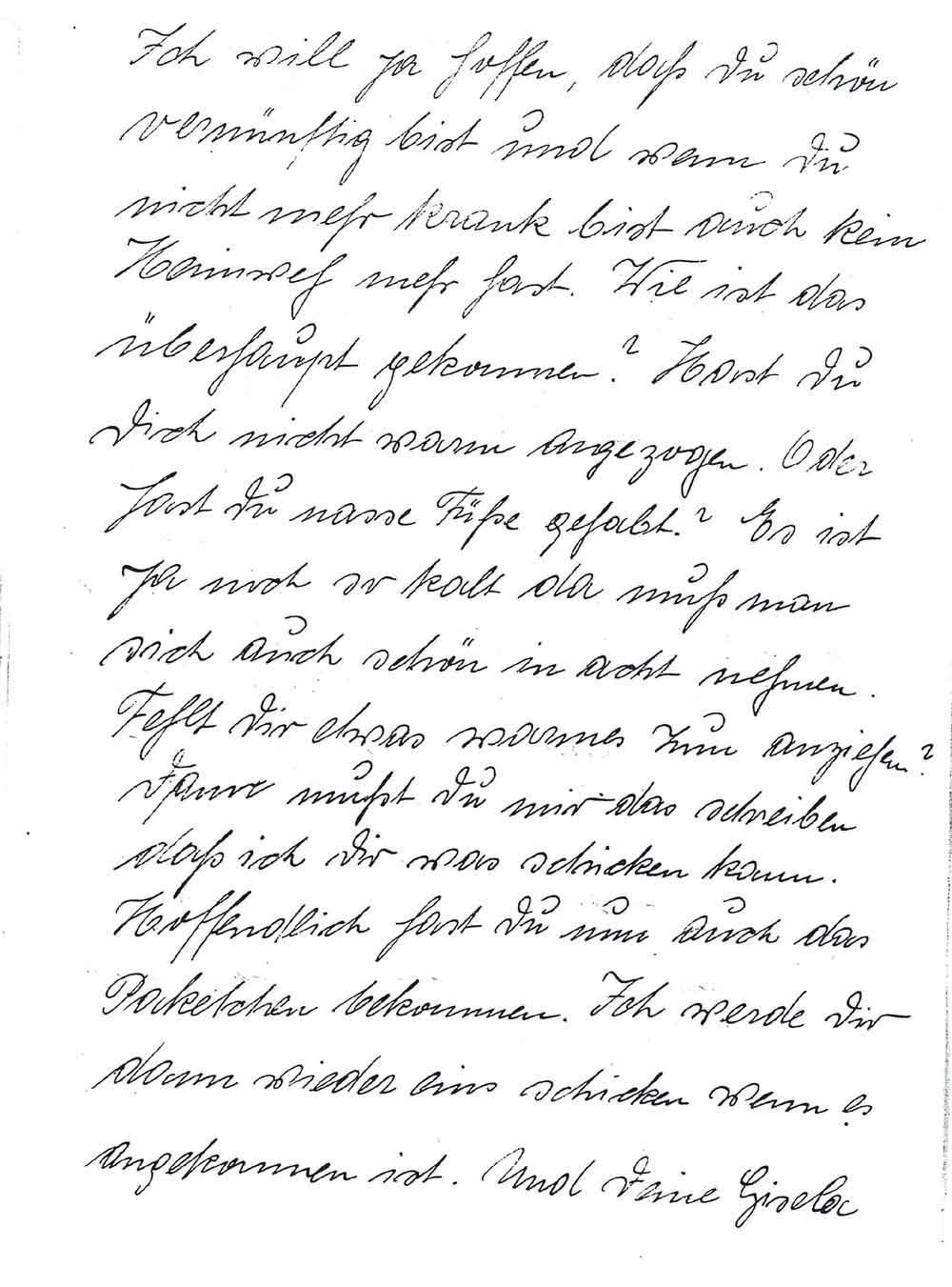 Ich will ja hoffen, daß Du schön vernünftig bist und wenn Du nicht mehr krank bist auch kein Heimweh mehr hast. Wie ist das überhaupt gekommen? Hast Du Dich nicht warm angezogen. Oder hast Du nasse Füße gehabt? Es ist ja noch so kalt da muß man sich auch schön in acht nehmen. Fehlt Dir etwas warmes zum anziehen? Dann mußt Du mir das schreiben daß ich Dir was schicken kann. Hoffentlich hast Du nun auch das Paketchen bekommen. Ich werde Dir dann wieder eins schicken wenn es angekommen ist. Und Deine Gisela