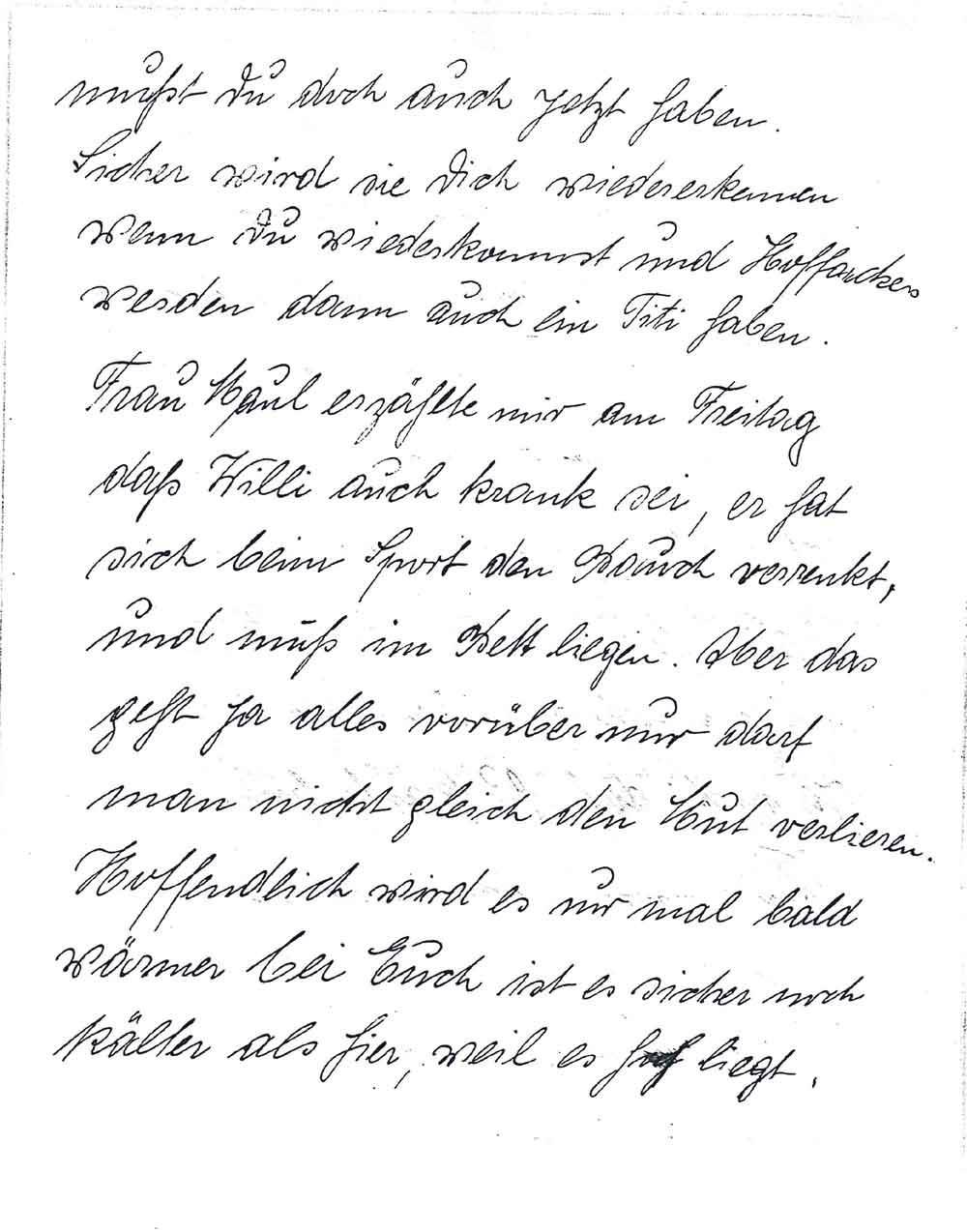 mußt Du doch auch jetzt haben. Sicher wird sie Dich wiedererkennen wenn Du wiederkommst und Hoffackers werden dann auch ein Titi haben. Frau Maul erzählte mir am Freitag daß Willi auch krank sei, er hat sich beim Sport den Bauch verrenkt und muß im Bett liegen. Aber das geht ja alles vorüber nur darf man nicht gleich den Mut verlieren. Hoffentlich wird es nur mal bald wärmer bei Euch ist es sicher noch kälter als hier weil es hoch liegt.