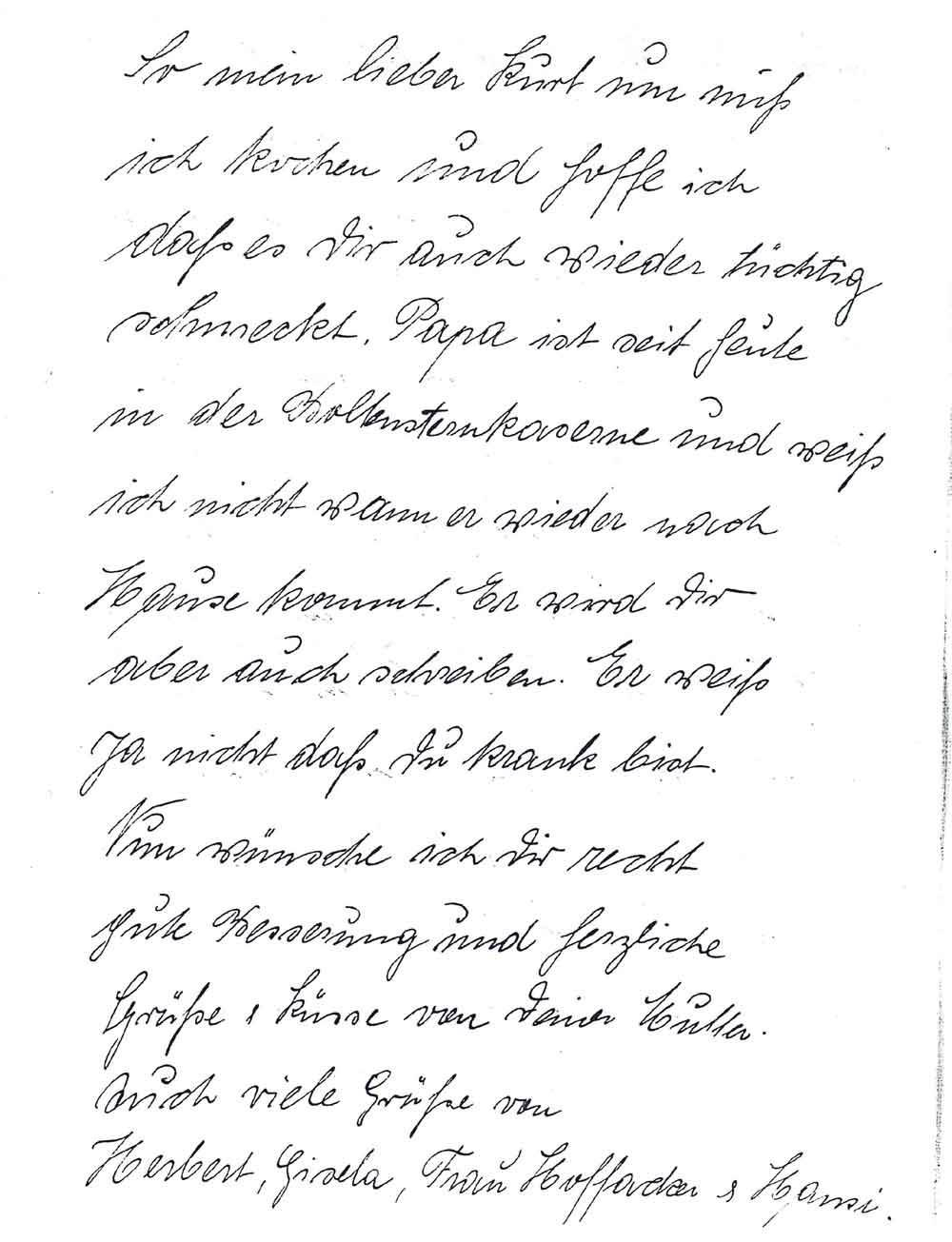 So mein lieber Kurt nun muß ich kochen und hoffe daß es Dir auch wieder tüchtig schmeckt. Papa ist seit heute in der Boltensternkaserne und weiß ich nicht wann er wieder nach Hause kommt. Er wird Dir aber auch schreiben. Er weiß ja nicht daß Du krank bist.