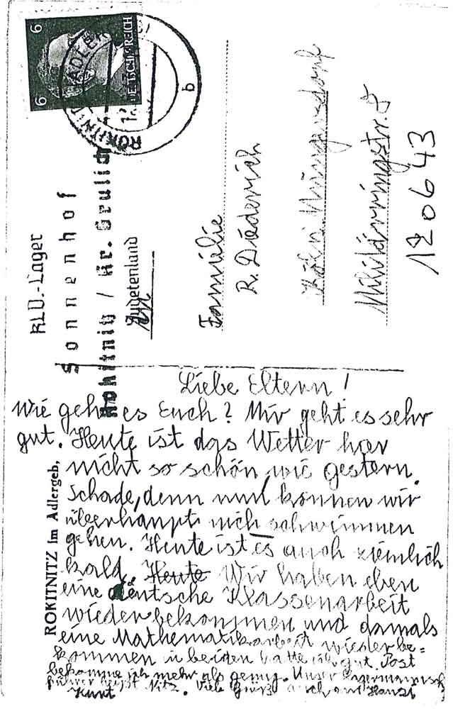 Wie geht es Euch? Mir geht es sehr gut. Heute ist das Wetter hier nicht so schön wie gestern. Schade, denn noch können wir überhaupt nich schwimmen gehen. Heute ist es auch ziemlich kalt. Wir haben eben eine deutsche Klassenarbeit wiederbekommen und damals eine Mathematikarbeit wiederbekommen in beiden hatte ich gut. Post gekomme ich mehr als genug. Unser Lagermannschaftsführer heißt Nitz. Viele Grüße auch an Hansi