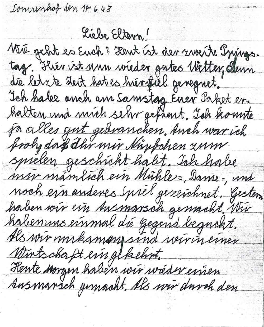 Wie geht es Euch? Heut ist der zweite Ppingstag. Hier ist nun wieder gutes Wetter, denn die letzte Zeit hat es hier viel geregnet. Ich habe auch am Samstag Euer Paket erhalten und mich sehr gefreut. Ich konnte ja alles gut gebrauchen. Auch war ich froh, daß Ihr mir Nüpfchen [?] zum spielen geschickt habt. Ich habe mir nämlich ein Mühle=, Dame= und noch ein anderes Spiel gezeichnet. Gestern haben wir ein Ausmarsch gemacht. Wir haben uns einmal die Gegend beguckt. Als wir umkamen sind wir in einer Wirtschaft eingekehrt.