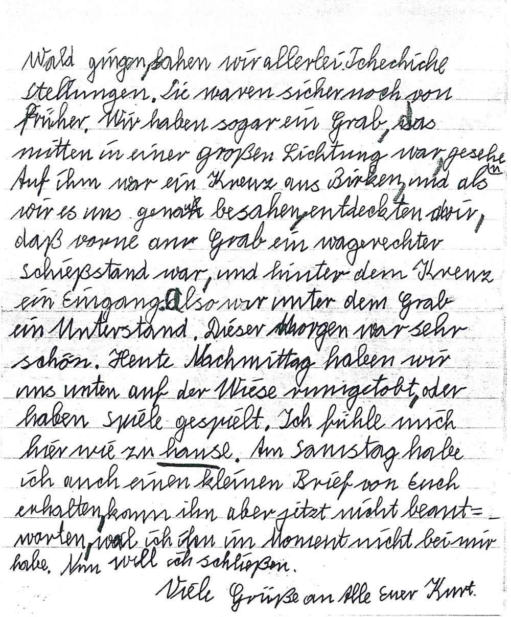Wald gingen, sahen wir allerlei Tchechiche Stellungen. Sie waren sicher noch von früher. Wir haben sogar ein Grab, das mitten in einer großen Lichtung war, gesehen. Auf ihm war ein Kreuz aus Birken, und als wir es uns genau besahen, entdeckten wir, daß vorne am Grab ein wagerechter Schießstand war, und hinter dem Kreuz ein Eingang. Also war unter dem Grab ein Unterstand. Dieser Morgen war sehr schön. Heute Nachmittag haben wir uns unten auf der Wiese rumgetobt, oder haben Spiele gespielt. Ich fühle mich hier wie zu Hause. Am Samstag habe ich auch einen kleinen Brief von Euch erhalten, kann ihn aber jetzt nicht beantworten, weil ich ihn im Moment nicht bei mir habe. Nun will ich schließen.