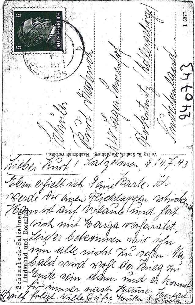 Eben erhielt ich Deine Karte. Ich werde Dir einen Flicklappen schicken. Hans ist auf Urlaub und hat sich mit Marga verheiratet. Leider bekommen wir ihn nun alle nicht zu sehen. Na, bald wird wohl der Krieg zu Ende sein dann und er kommt für immer nach Hause. Brief folgt. Viele Grüße Mutter + Herbert + Gisela
