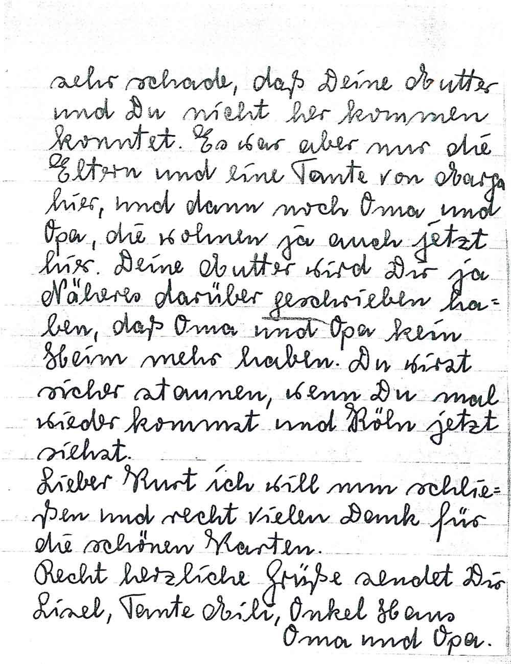 sehr schade, daß Deine Mutter und Du nicht her kommen konntet. Es war aber nur die Eltern und eine Tante von Marga hier, und dann noch Oma und Opa, die wohnen ja auch jetzt hier. Deine Mutter wird Dir ja Näheres darüber geschrieben haben, daß Oma und Opa kein Heim mehr haben. Du wirst sicher staunen wenn Du mal wieder kommst und Köln jetzt siehst.