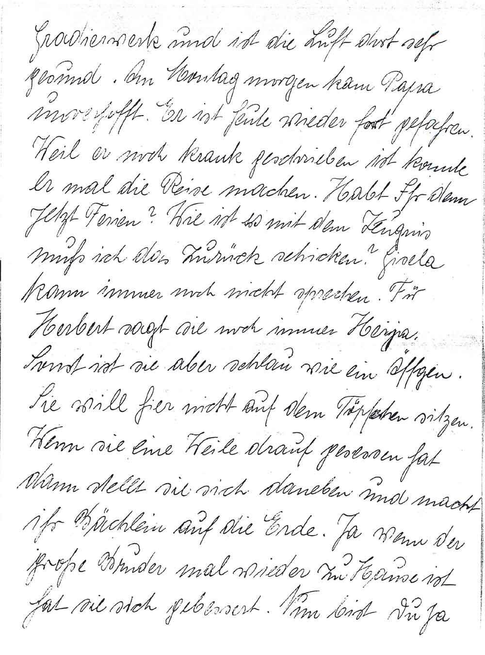 Gradierwerk und ist die Luft dort sehr gesund. Am Montag morgen kam Papa unverhofft. Er ist heute wieder fort gefahren. Weil er noch krank geschrieben ist konnte er mal die Reise machen. Habt Ihr denn jetzt Ferien? Wie ist es mit dem Zeugnis muß ich das zurück schicken? Gisela kann immer noch nicht sprechen. Für Herbert sagt sie noch immer Heija. Sonst ist sie aber schlau wie ein Äffgen. Sie will hier nicht auf dem Töpfchen sitzen. Wenn sie eine Weile darauf gesessen hat dann stellt sie sich daneben und macht ihr Bächlein auf die Erde. Ja wenn der große Bruder mal wieder zu Hause ist hat sie sich gebessert. Nun bist Du ja