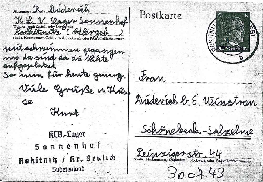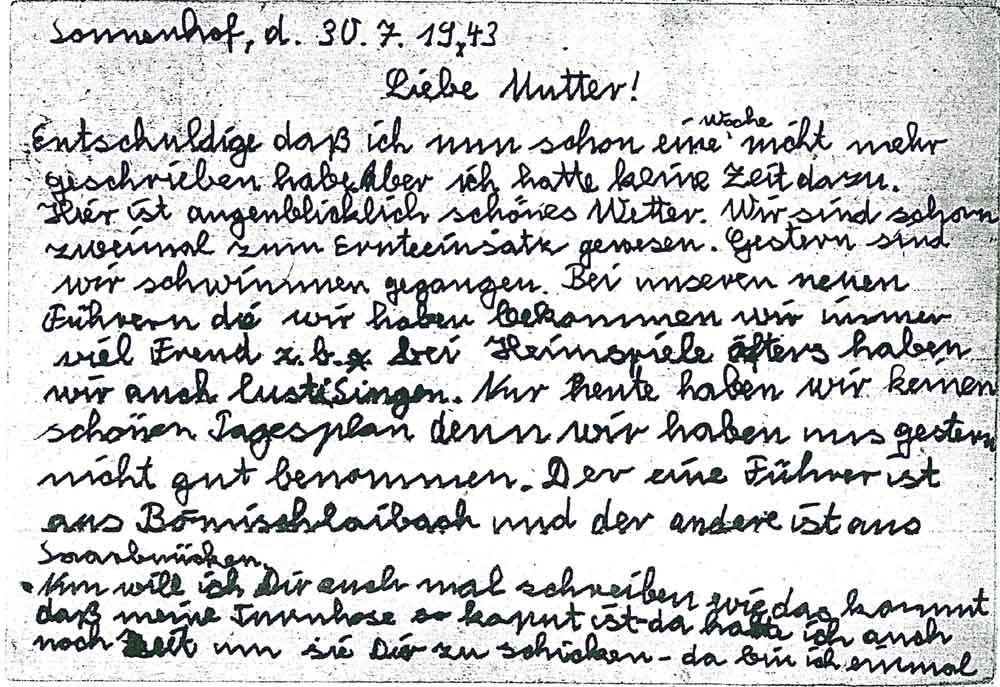 Entschuldige daß ich nun schon eine Woche nicht mehr geschrieben habe, aber ich hatte keine Zeit dazu. Hier ist augenblicklich schönes Wetter. Wir sind schon zweimal zum Ernteeinsatz gewesen. Gestern sind wir schwimmen gegangen. Bei unseren neuen Führern die wir haben bekommen wir immer viel Freud z.b. bei Heimspiele öfters haben wir auch lusti.Singen. Nur heute haben wir keinen schönen Tagesplan denn wir haben uns gestern nicht gut benommen. Der eine Führer ist aus Bomischlaibach und der andere ist aus Saarbrücken.