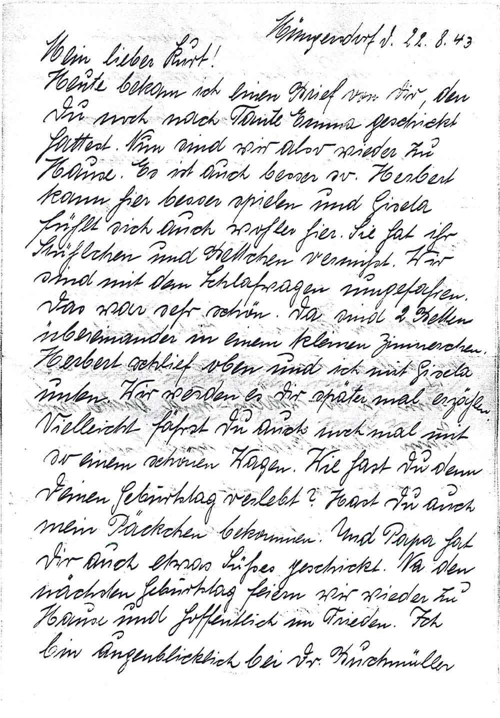 Heute bekam ich einen Brief von Dir, den Du noch nach Tante Emma geschickt hattest. Nun sind wir also wieder zu Hause. Es ist auch besser so. Herbert kann hier besser spielen und Gisela fühlt sich auch wohler hier. Sie hat ihr Stühlchen und Bettchen vermißt. Wir sind mit dem Schlafwagen umgefahren. Das war sehr schön. Da sind 2 Betten übereinander in einem kleinen Zimmerchen. Herbert schlief oben und ich mit Gisela unten. Wir werden es Dir später mal erzählen. Vielleicht fährst Du auch noch mal mit so einem schönen Wagen. Wie hast Du denn Deinen Geburtstag verlebt? Hast Du auch mein Päckchen bekommen. Und Papa hat Dir auch etwas Süßes geschickt. Na den nächsten Geburtstag feiern wir wieder zu Hause und hoffentlich im Frieden. Ich bin augenblicklich bei Dr. Kuchmüller