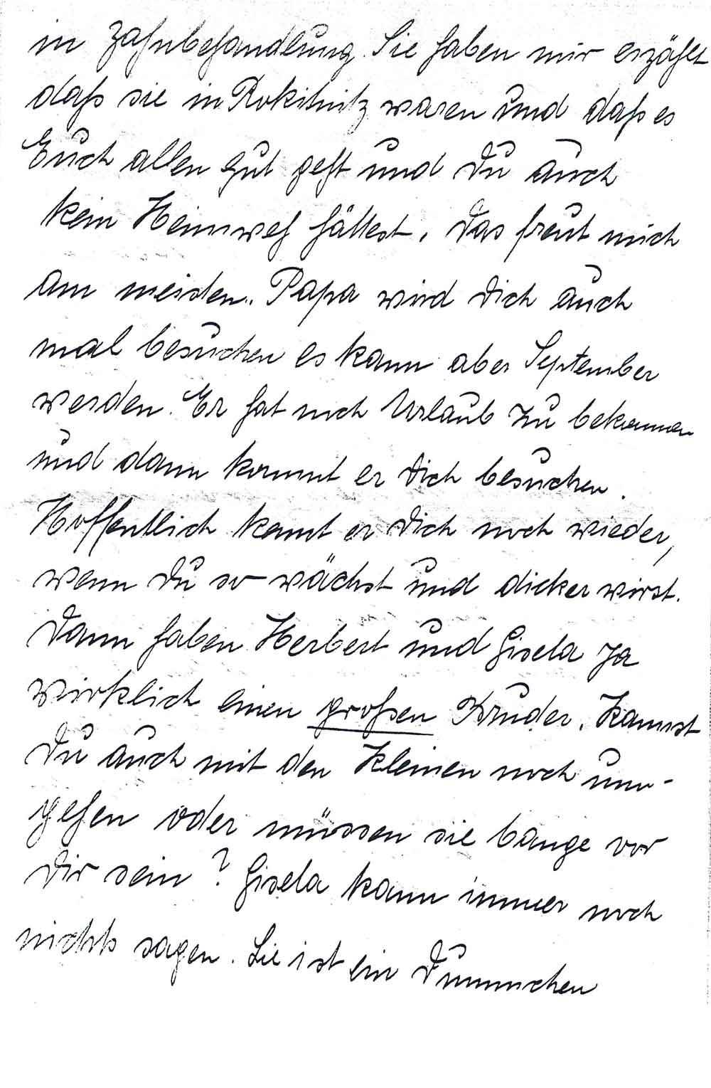 in Zahnbehandlung. Sie haben mir erzählt daß sie in Rokitnitz waren und daß es Euch allen gut geht und Du auch kein Heimweh hättest. Das freut mich am meisten. Papa wird Dich auch mal besuchen es kann aber September werden. Er hat noch Urlaub zu bekommen und dann kommt er Dich besuchen. Hoffentlich kennt er Dich noch wieder, wenn Du so wächst und dicker wirst. Dann haben Herbert und Gisela ja wirklich einen großen Bruder. Kannst Du auch mit den Kleinen noch umgehen oder müssen sie bange vor dir sein? Gisela kann immer noch nichts sagen. Sie ist ein Dummchen