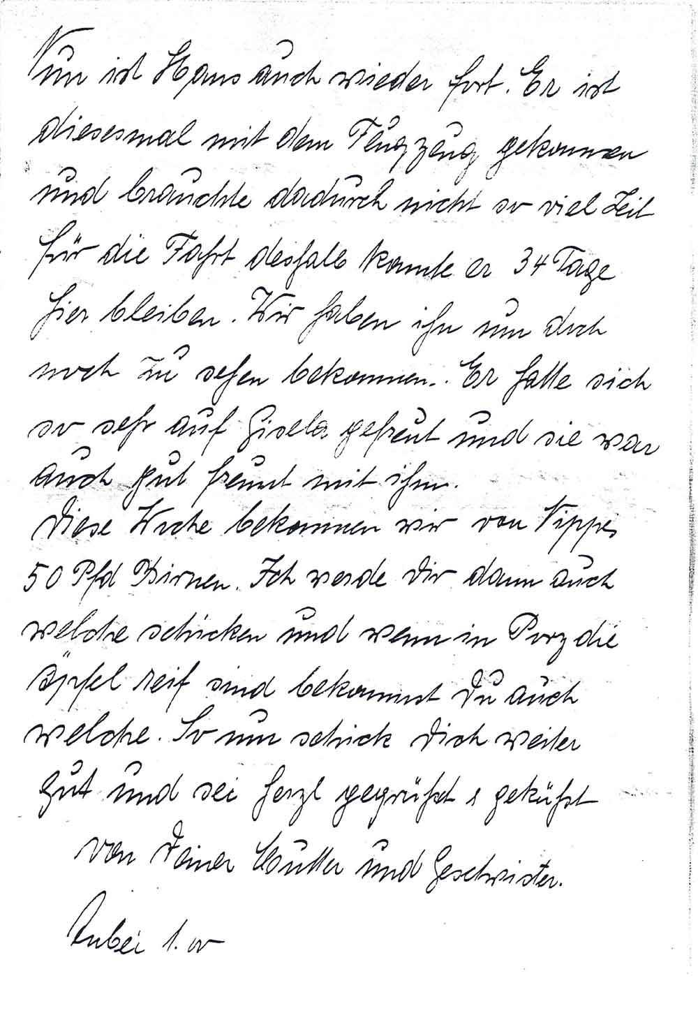 Diese Woche bekommen wir von Nippes 50 Pfd Birnen. Ich werde Dir dann auch welche schicken und wenn in Porz die Äpfel reif sind bekommst Du auch welche. So nun schick Dich weiter gut und sei herzl. gegrüßt + geküßt