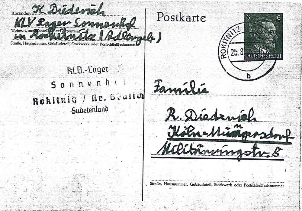 Wie geht es Euch? Heute habe ich von Liesel u. Tante Friede Post bekommen. Von Tante Friede habe ich 5 RM geschickt bekommen. Ich möcht Euch nun einmal fragen, ob ich mir ein Postsparbuch hier an der Post holen darf. Hier haben schon manche Jungen eins. Denn ich habe nun wieder 29 RM. Das Sparbuch nimmt dann Heer Grod in Verwahr. Am Montag waren wir den ganzen Morgen zum Ernteeinsatz. Wir haben Garben aufgestellt. Morgen gehen wir ins Kino.