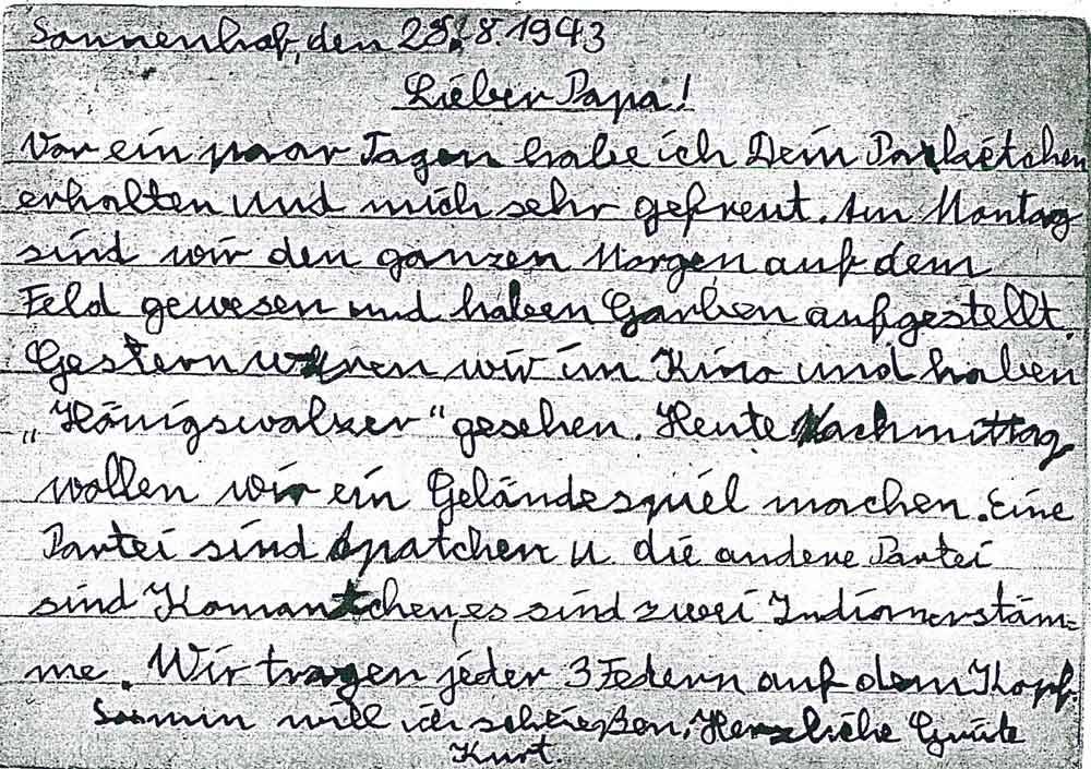 Vor ein paar Tagen habe ich Dein Paketchen erhalten und mich sehr gefreut. Am Montag sind wir den ganzen Morgen auf dem Feld gewesen und haben Garben aufgestellt. Gestern waren wir im Kino und haben "Königswalzer" gesehen. Heute nachmittag wollen wir ein Geländespiel machen. Eine Partei sind die Apatchen u. die andere Partei sind Komantchen, es sind zwei Indianerstämme. Wir tragen jeder 3 Federn auf dem Kopf.