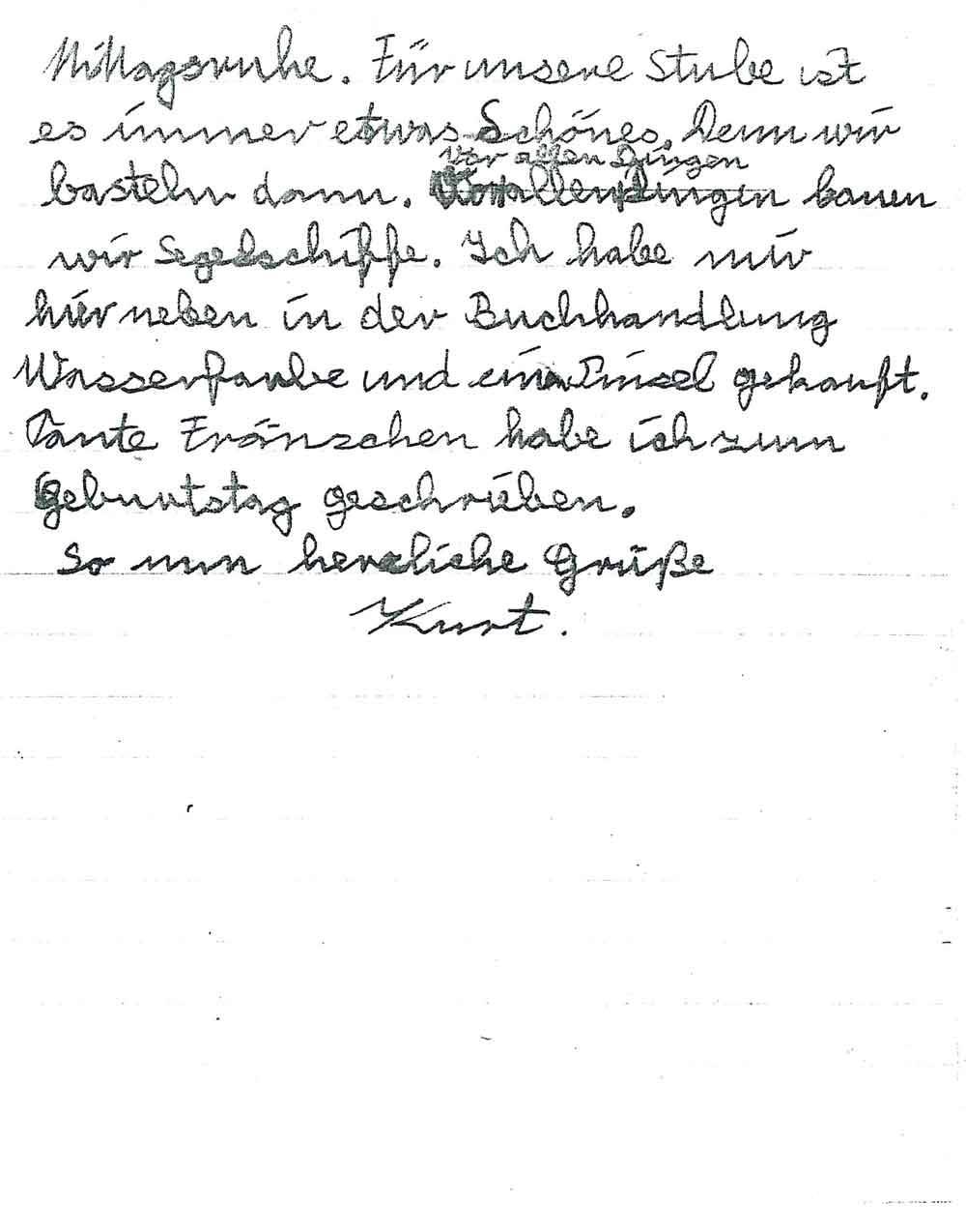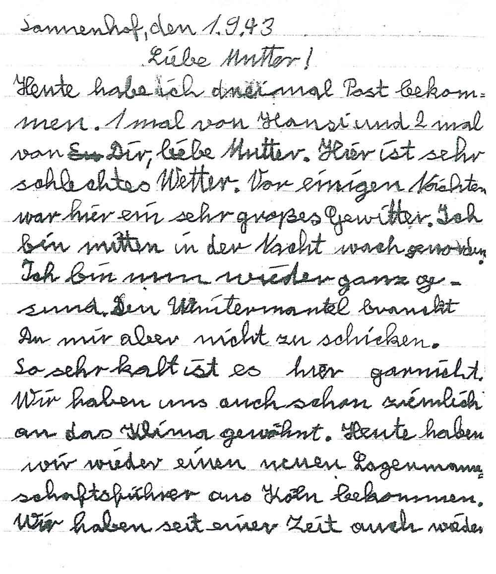 Heute habe ich dreimal Post bekommen. 1 mal von Hansi und 2 mal von Dir, liebe Mutter. Hier ist sehr schlechtes Wetter. Vor einigen Nächten war hier ein sehr großes Gewitter. Ich bin mitten in der Nacht wach geworden. Ich bin nun wieder ganz gesund. Den Wintermantel brauchst Du mit aber nicht zu schicken. So sehr kalt ist es hier garnicht. Wir haben uns auch schon ziemlich an das Klima gewöhnt. Heute haben wir wieder einen neuen Lagermannschaftsführer aus Köln bekommen. Wir haben seit einer Zeit auch wieder