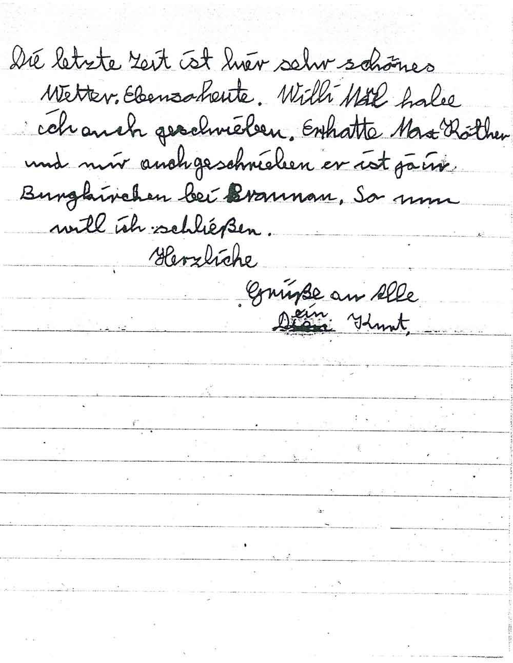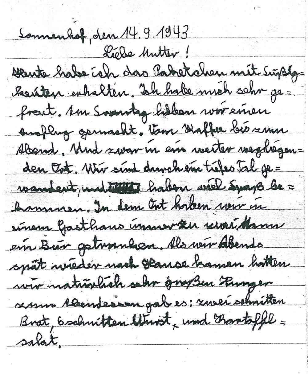 Heute habe ich das Paketchen mit Süßigkeiten erhalten. Ich habe mich sehr gefreut. Am Sonntag haben wir einen Ausflug gemacht. Vom Kaffee bis zum Abend. Und zwar in ein weiter wegliegenden Ort. Wir sind durch ein tiefes Tal gewandert, und haben viel Spaß bekommen. In dem Ort haben wir in einem Gasthaus immer zu zwei Mann ein Bier getrunken. Als wir Abends spät wieder nach Hause kamen hatten wir natürlich sehr großen Hunger zum Abendessen gab es: zwei schnitten Brot, 6 schnitten Wurst und Kartoffelsalat.