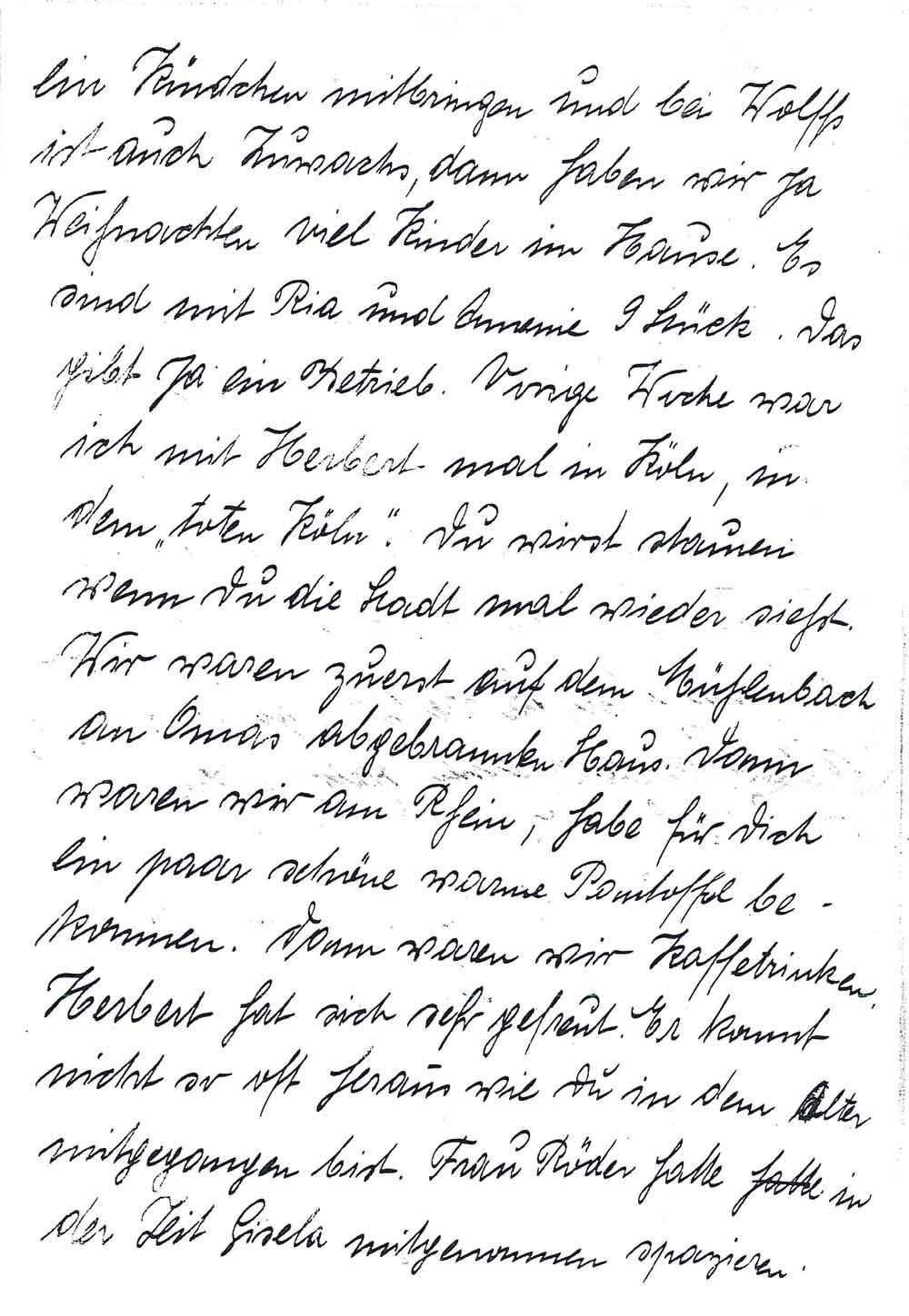 ein Kindchen mitbringen und bei Wolffs ist auch Zuwachs, dann haben wir ja Weihnachten viel Kinder im Hause. Es sind mit Ria und Annemie 9 Stück. Das gibt ja ein Betrieb. Vorige Woche war ich mit Herbert mal in Köln, in dem "toten Köln". Du wirst staunen wenn Du die Stadt mal wider siehst. Wir waren zuerst auf dem Mühlenbach an Omas abgebranntem Haus. Dann waren wir am Rhein, habe für Dich ein paar schöne warme Pantoffel bekommen. Dann waren wir Kaffetrinken. Herbert hat sich sehr gefreut. Er kommt nicht so oft heraus wie Du in dem Alter mitgegangen bist. Frau Röder hatte in der Zeit Gisela mitgenommen spazieren.