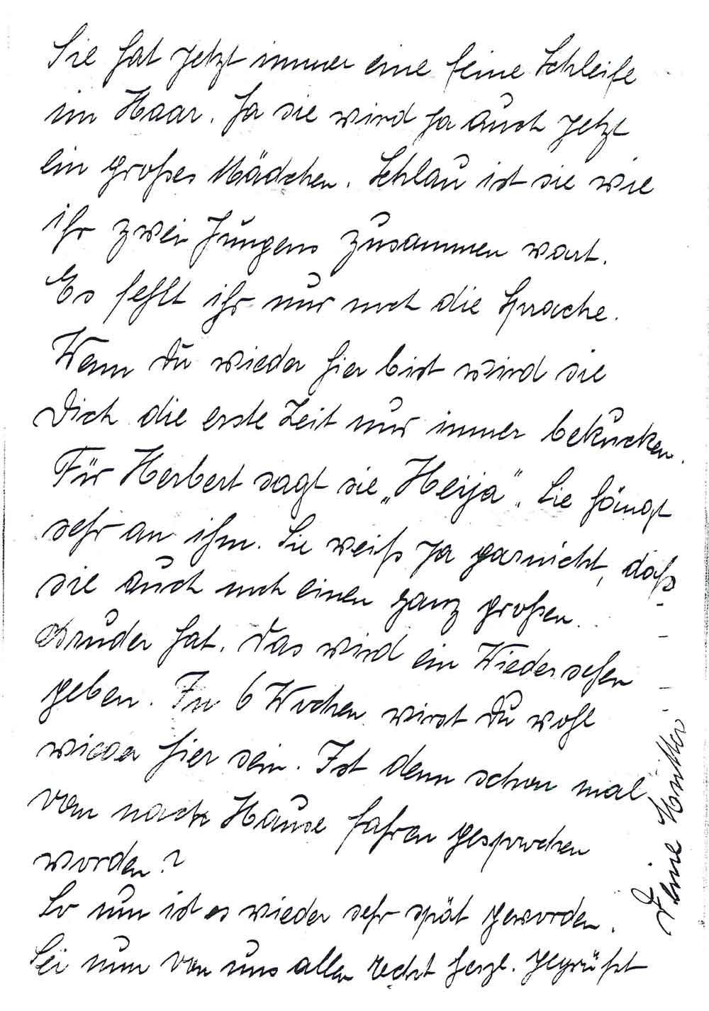 Sie hat jetzt immer eine feine Schleife im Haar. Ja sie wird ja auch jetzt ein großes Mädchen. Schlau ist die wie ihr zwei Jungen zusammen wart. Es fehlt ihr nur noch die Sprache. Wenn Du wieder hier bist wird sie Dich die erste Zeit nur immer bekucken. Für Herbert sagt sie "Heija". Sie hängt sehr an ihm. Sie weiß ja garnicht, daß sie auch noch einen ganz großen Bruder hat. Das wird ein Wiedersehen geben. In 6 Wochen wirst Du wohl wieder hier sein. Ist denn schon mal von nach Hause fahren gesprochen worden?