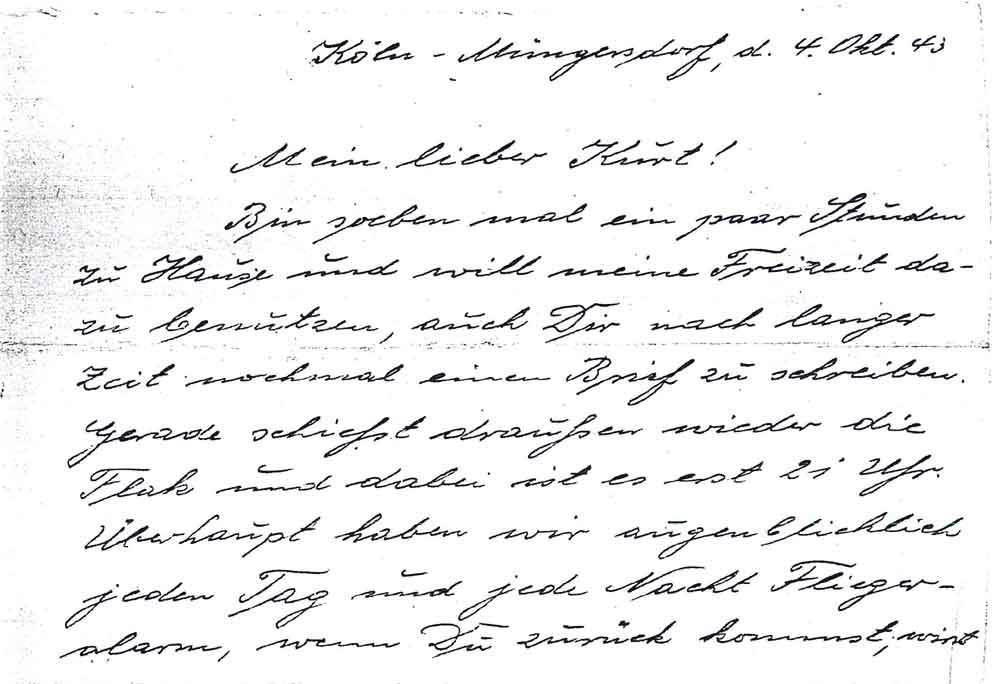 Bin soeben mal ein paar Stunden zu Hause und will meine Freizeit dazu benutzen, auch Dir nach langer Zeit nochmal einen Brief zu schreiben. Gerade schießt draußen wieder die Flak und dabei ist es erst 21 Uhr. Überhaupt haben wir augenblicklich jeden Tag und jede Nacht Fliegeralarm, wenn Du zurück kommst, wirst