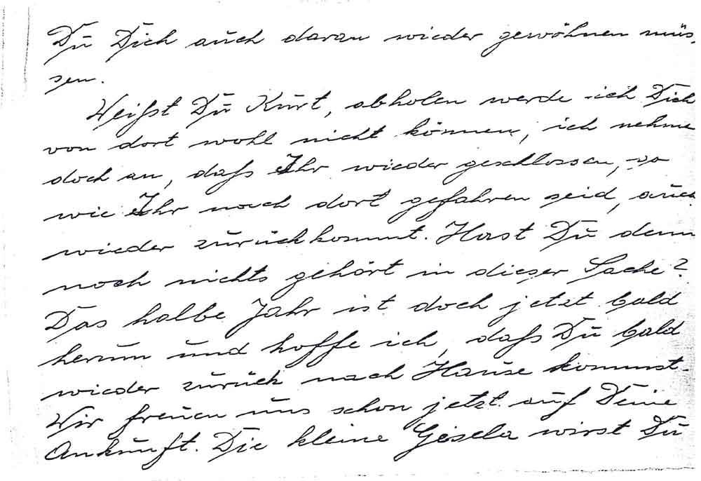 Weißt Du Kurt, abholen werde ich Dich von dort wohl nicht können, ich nehme doch an, daß Ihr wieder geschlossen, so wie Ihr nach dort gefahren seid, auch wieder zurückkommt. Hast Du denn noch nichts gehört in dieser Sache? Das halbe Jahr ist doch jetzt bald herum und hoffe ich, daß Du bald wieder zurück nach Hause kommst. Wir freuen uns schon jetzt auf Deine Ankunft. Die kleine Gisela wirst Du