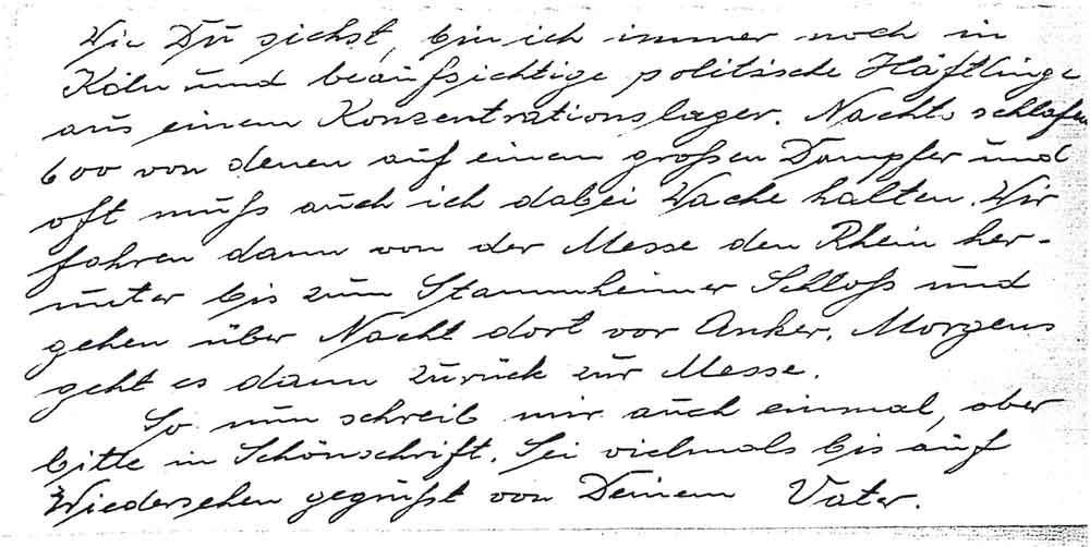 Wie Du siehst, bin ich immer noch in Köln und beaufsichtige politische Häftlinge aus einem Konzentrationslager. Nachts schlafen 600 von denen auf einem großen Dampfer und oft muß auch ich dabei Wache halten. Wir fahren dann von der Messe den Rhein herunter bis zum Stammheimer Schloß und gehen über Nacht dort vor Anker. Morgens geht es dann zurück zur Messe.