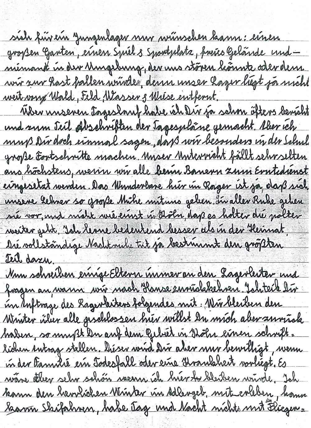 Nun schreiben einige Eltern immer an den Lagerleiter und fangen an, wann wir nach Hause zurückkehren. Ich teile Dir im Auftrage des Lagerleiters folgendes mit: Wir bleiben den Winter über alle geschlossen hier willst Du mich aber zurück haben, so mußt Du auf dem Gebiet in Köln einen schriftlichen Antrag stellen. Dieser wird Dir aber nur bewilligt, wenn in der Familie ein Todesfall oder eine Krankheit vorliegt. Es wäre aber sehr schön wenn ich hier bleiben würde. Ich kann den herrlichen Winter im Adlergeb. miterleben, kann Skifahren, habe Tag und Nacht nichts mit dem Flieger-