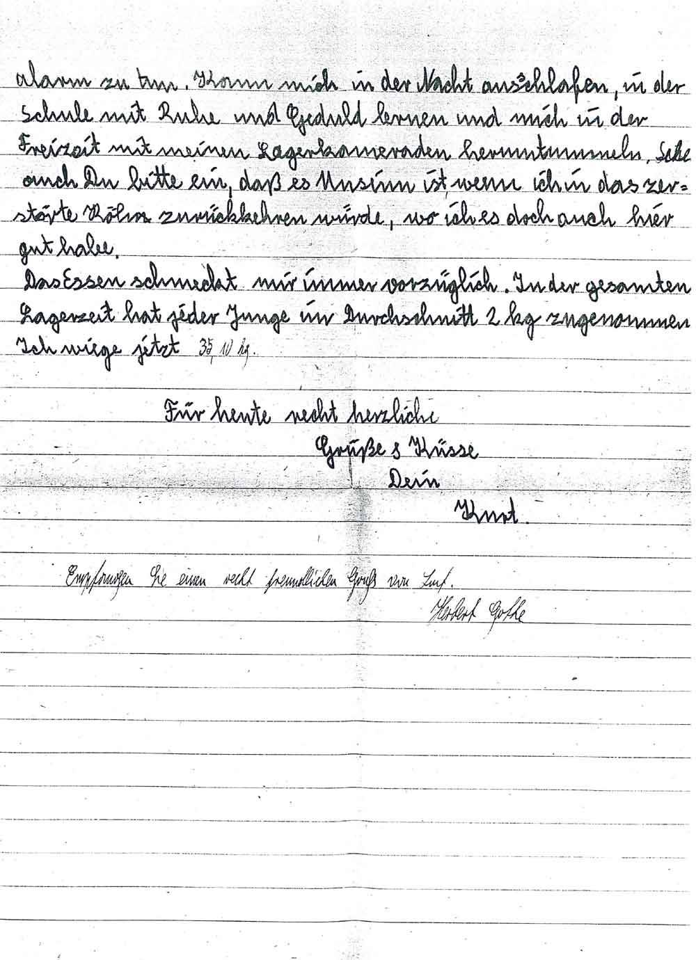alarm zu tun. Kann mich in der Nacht ausschlafen, in der Schule mit Ruhe und Geduld lernen und mich in der Freizeit mit meinen Lagerkameraden herumtummeln. Sehe auch Du bitte ein, daß es Unsinn ist, wenn ich in das zerstörte Köln zurückkehren wurde, wo ich es doch auch hier gut habe.
