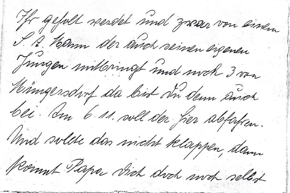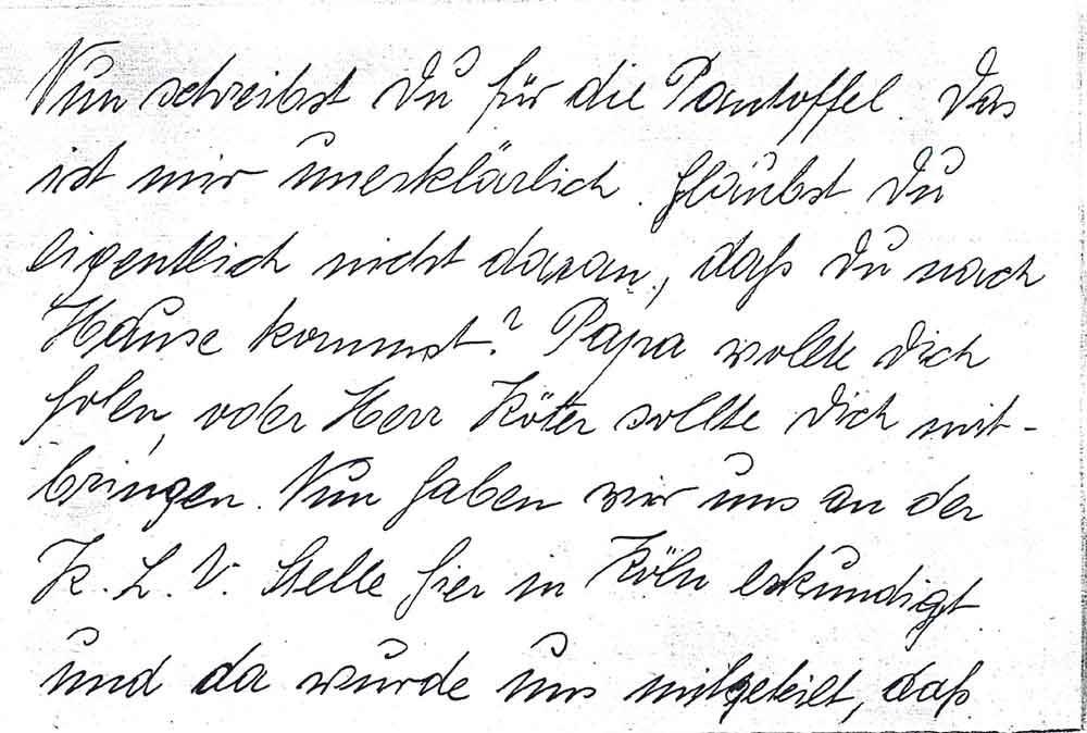 Nun schreibst Du für die Pantoffel. Das ist mir unerklärlich. Glaubst Du eigentlich nicht daran, daß Du nach Hause kommst? Papa wollte Dich holen, oder Herr Köter sollte Dich mitbringen. Nun haben wir uns an der K. L. V. Stelle hier in Köln erkundigt und da wurde uns mitgeteilt, daß