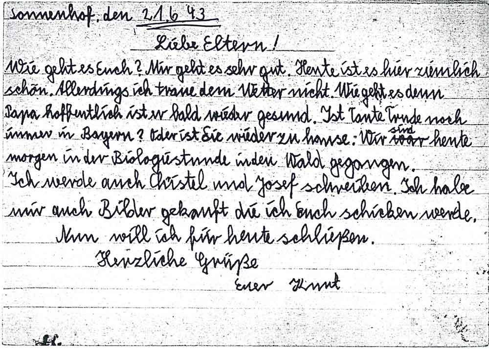 Wie geht es Euch? Mir geht es sehr gut. Heute ist es hier ziemlich schön. Allerdings ich traue dem Wetter nicht. Wie geht es denn Papa hoffentlich ist er bald wieder gesund. Ist Tante Trude noch immer in Bayern? Oder ist Sie wieder zu hause. Wir sind heute morgen in der Biologiestunde in den Wald gegangen.