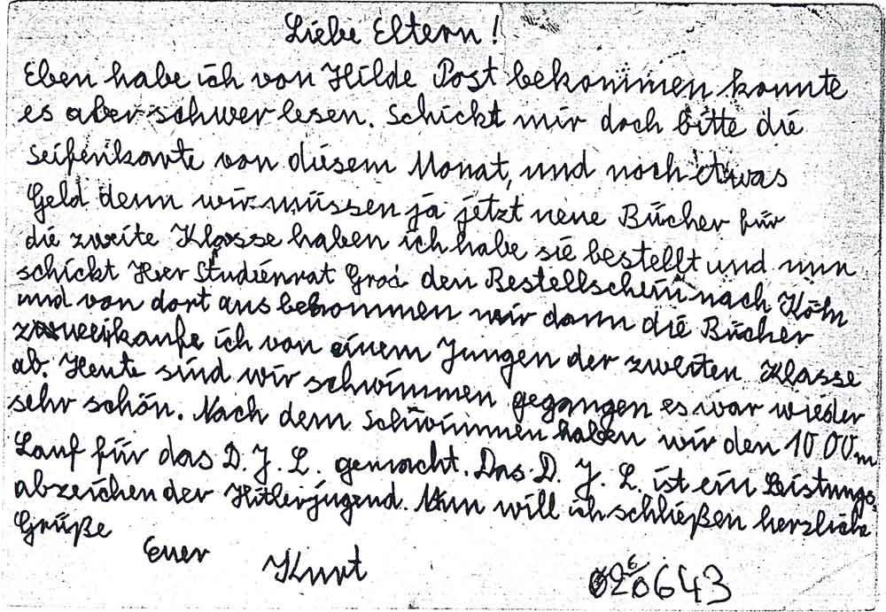 Eben habe ich von Hilde Post bekommen konnte es aber schwer lesen. Schickt mir doch bitte die Seifenkarte von diesem Monat, und noch etwas Geld denn wir müssen ja jetzt neue Bücher für die zweite Klasse haben ich habe sie bestellt und nun schickt Herr Studienrat Groi den Bestellschein nach Köln und von dort aus bekommen wir dann die Bücher zwei kaufe ich von einem Jungen der zweiten Klasse ab. Heute sind wir schwimmen gegangen es war wieder sehr schön. Nach dem Schwimmen haben wir den 1000 m Lauf für das D.J.L. gemacht. Das D.J.L. ist ein Leistungsabzeichen der Hitlerjugend. Nun will ich schließen herzliche Grüße