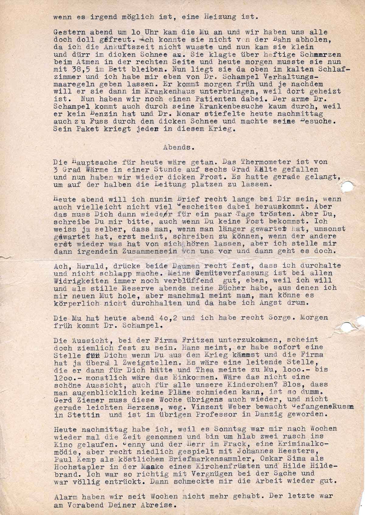 Gestern abend um 10 Uhr kam die Mu an, und wir haben uns alle doll gefreut. Ich konnte sie nicht von der Bahn abholen, weil ich die Ankunftszeit nicht wusste, und nun kam sie klein und dürr im dicken Schnee an. Sie klagte über heftige Schmerzen beim Atmen in der rechten Seite, und heute morgen musste sie mit 38,5 im Bett bleiben. Nun liegt sie da oben im kalten Schlafzimmer, und ich habe mir eben von Dr. Schampel Verhaltungsmaßregeln geben lassen. Er kommt morgen früh, und je nachdem will er sie dann im Krankenhaus unterbringen, weil dort geheizt ist. Nun haben wir noch einen Patienten dabei. Der arme Dr. Schampel kommt auch durch die Krankenbesuche kaum durch, weil er kein Benzin hat, und Dr. Monar stiefelte heute nachmittag auch zu Fuß durch den dicken Schnee und machte seine Besuche. Sein Paket krieg jeder in diesem Krieg.