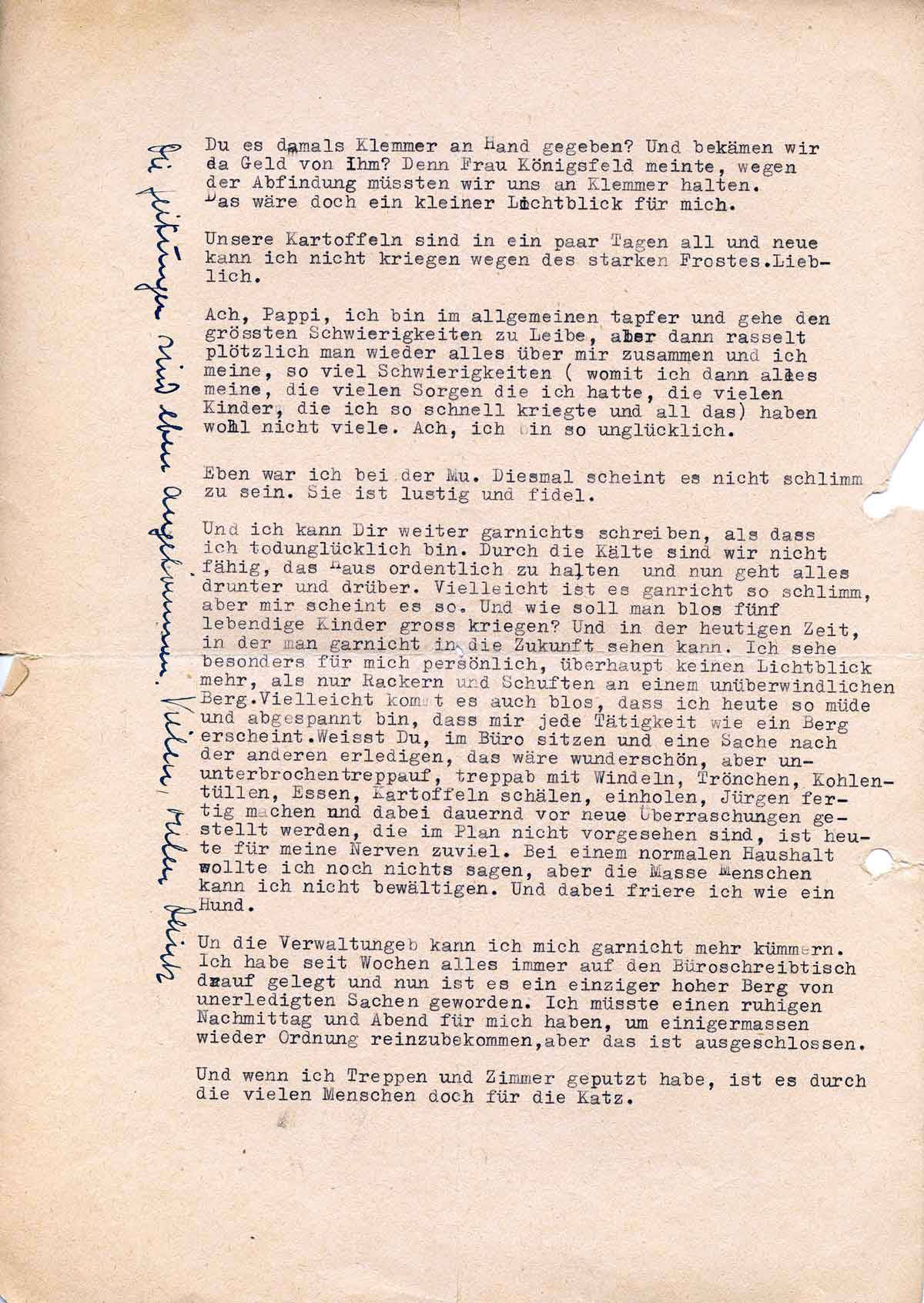 Ach Pappi, ich bin im allgemeinen tapfer und gehe en grössten Schwierigkeiten zu Leibe, aber dann rasselt plötzlich man wieder alles über mir zusammen und ich meine, so viel Schwierigkeiten (womit ich dann alles meine, die vielen Sorgen die ich hatte, die vielen Kinder, die ich so schnell kriegte und all das) haben wohl nicht viele. Ach, ich bin so unglücklich.