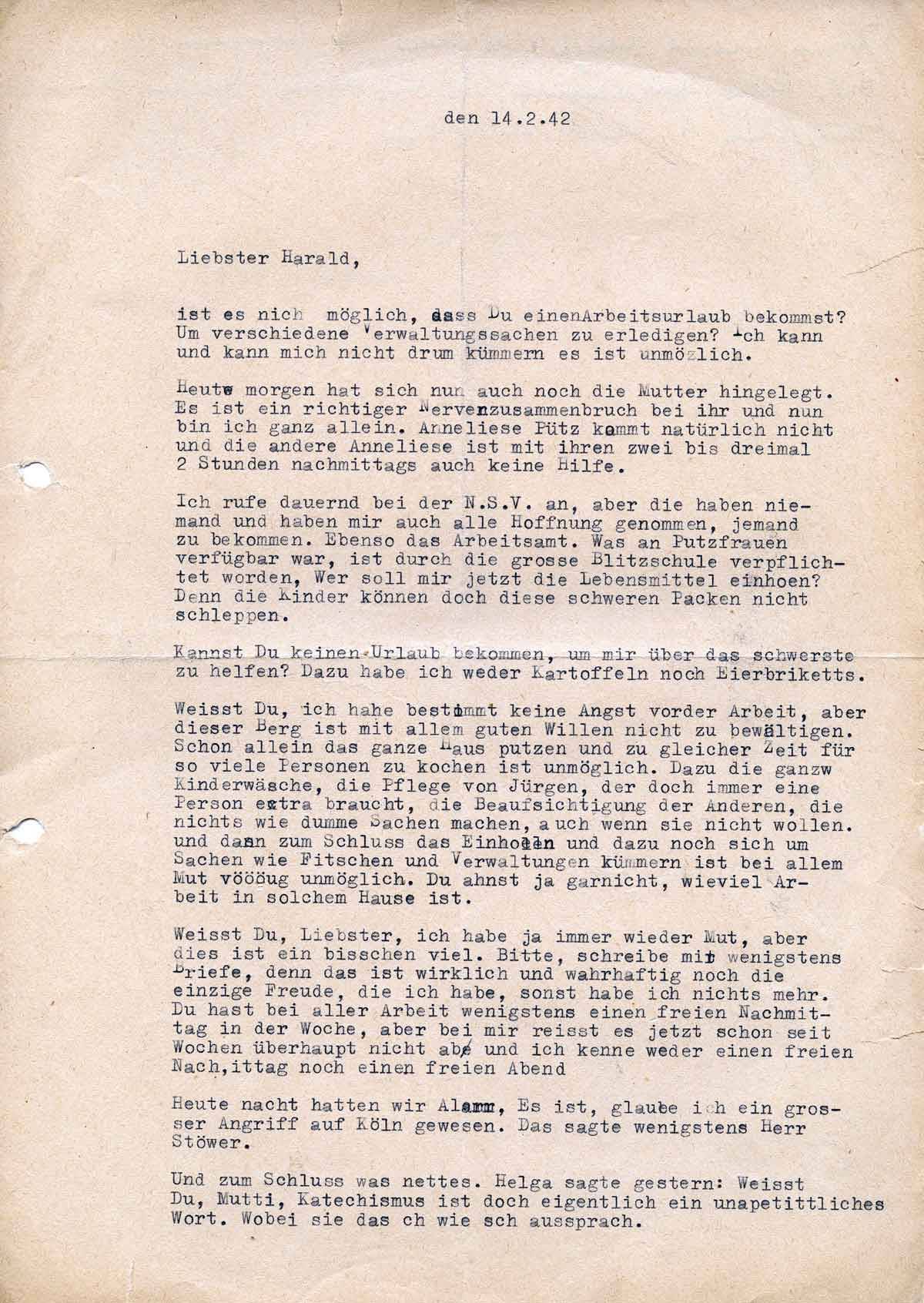 Charlotte Endemann an ihren Mann Harald, 14. Februar 1942